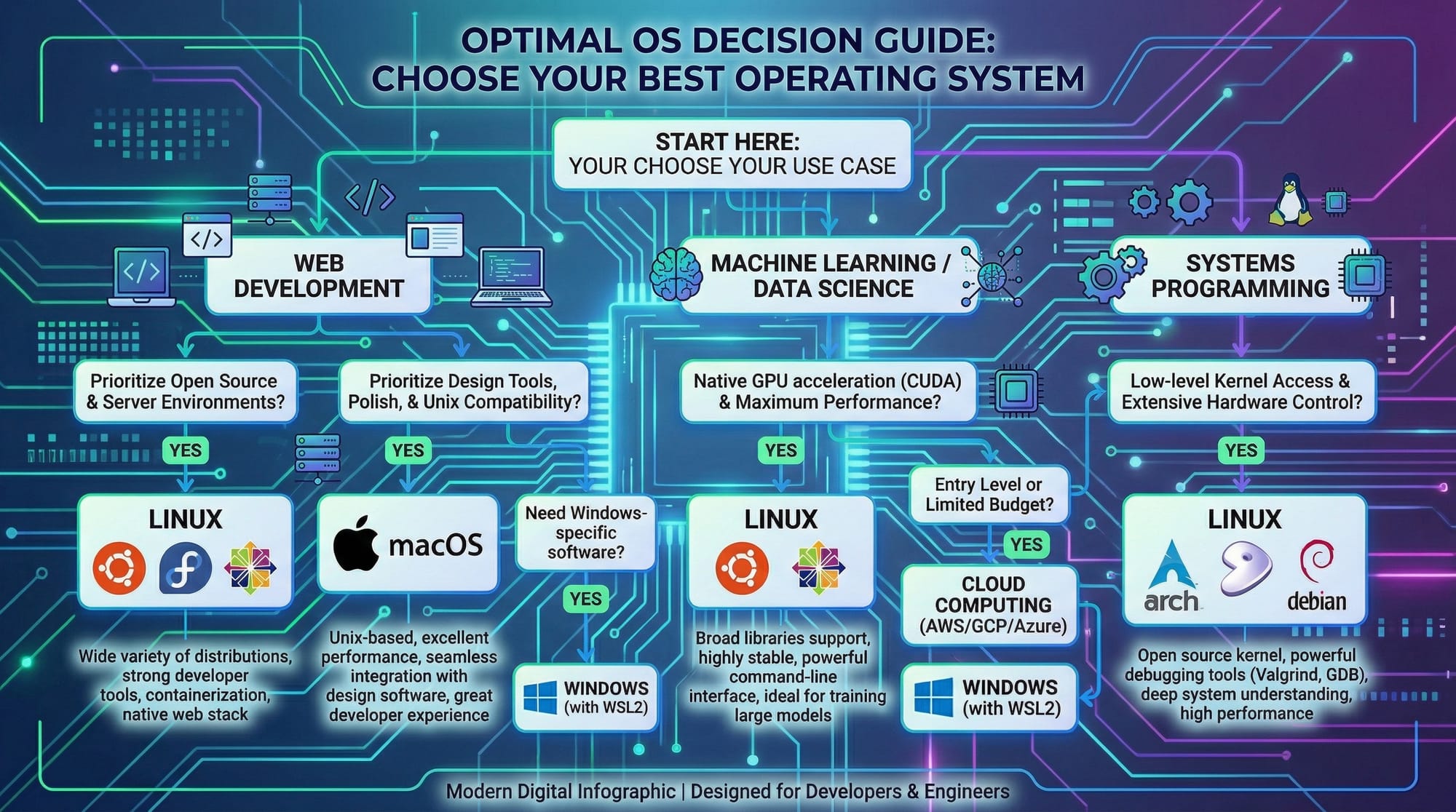 It depends on your goals. Linux excels for system and backend work, macOS for app development, and Windows for general-purpose coding with WSL2 support.
