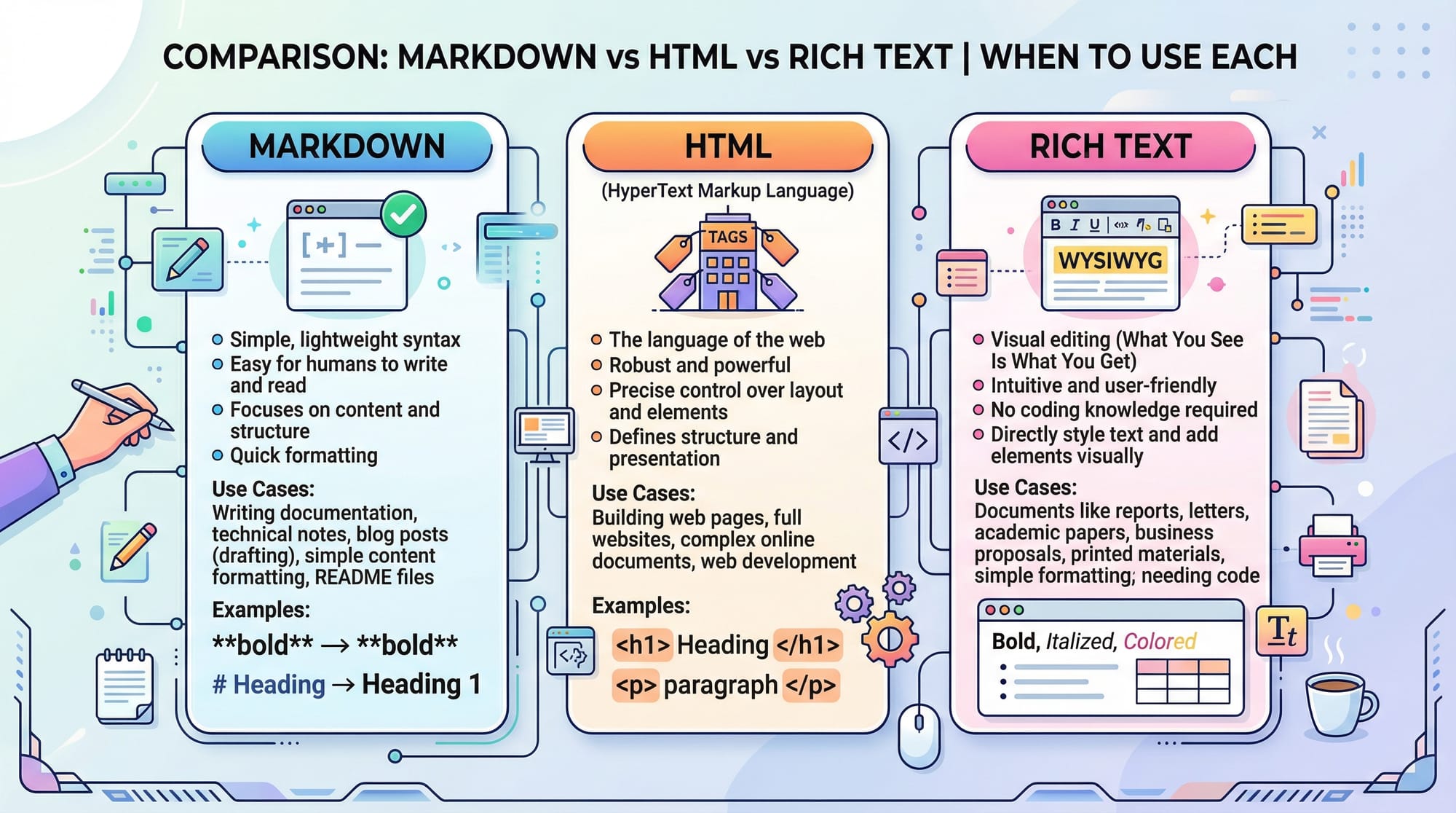 Markdown is simpler, readable in plain text, and converts easily to HTML. It’s faster for writing docs compared to full HTML tags.