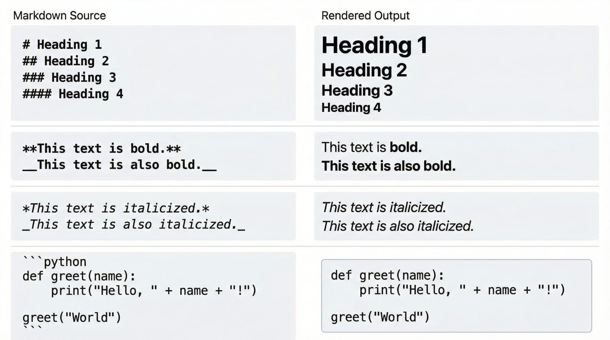 - Supports headings, bold/italic text, lists, tables, code blocks, links, images, and footnotes.