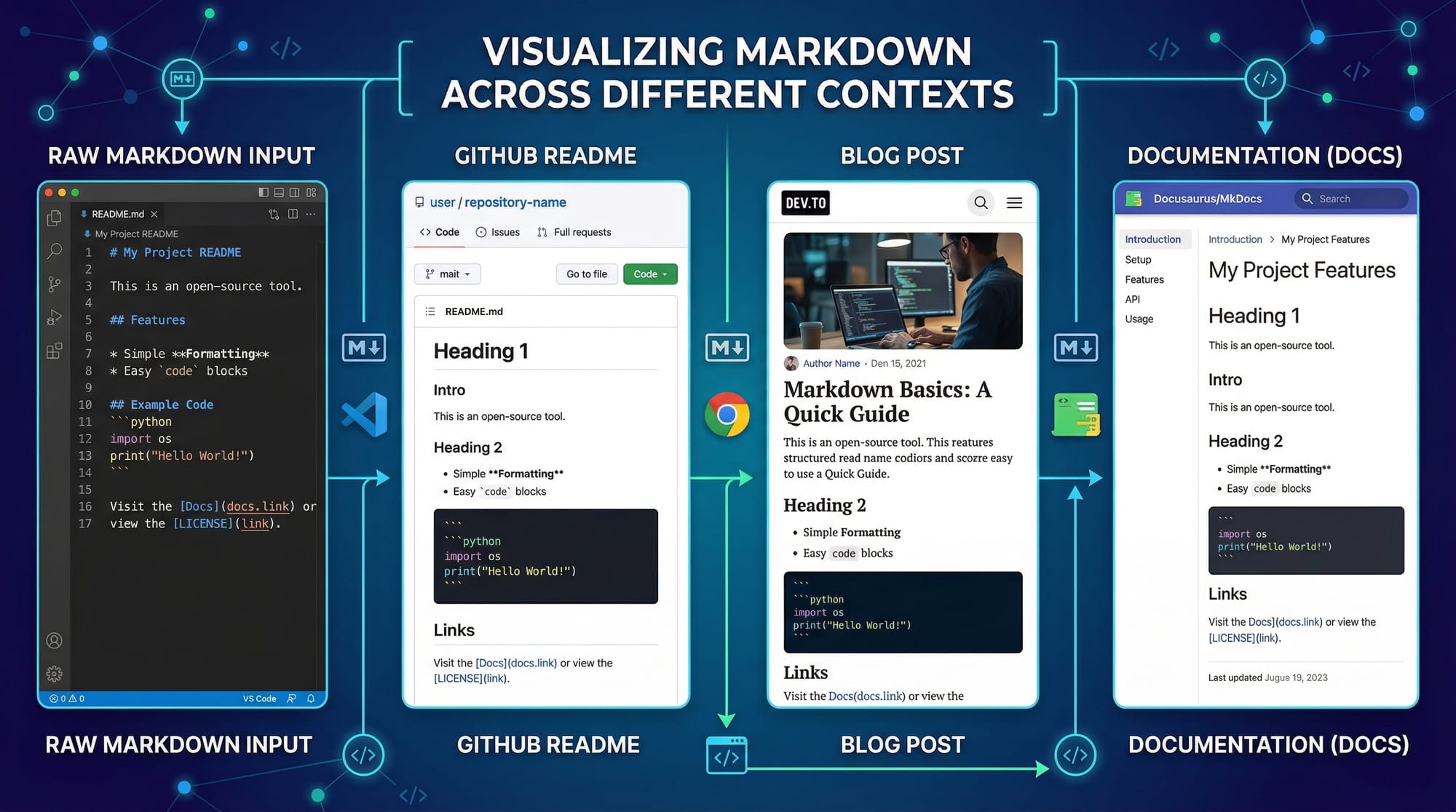 It is widely used in GitHub README files, technical blogs, project documentation, and notes in VS Code or Obsidian.