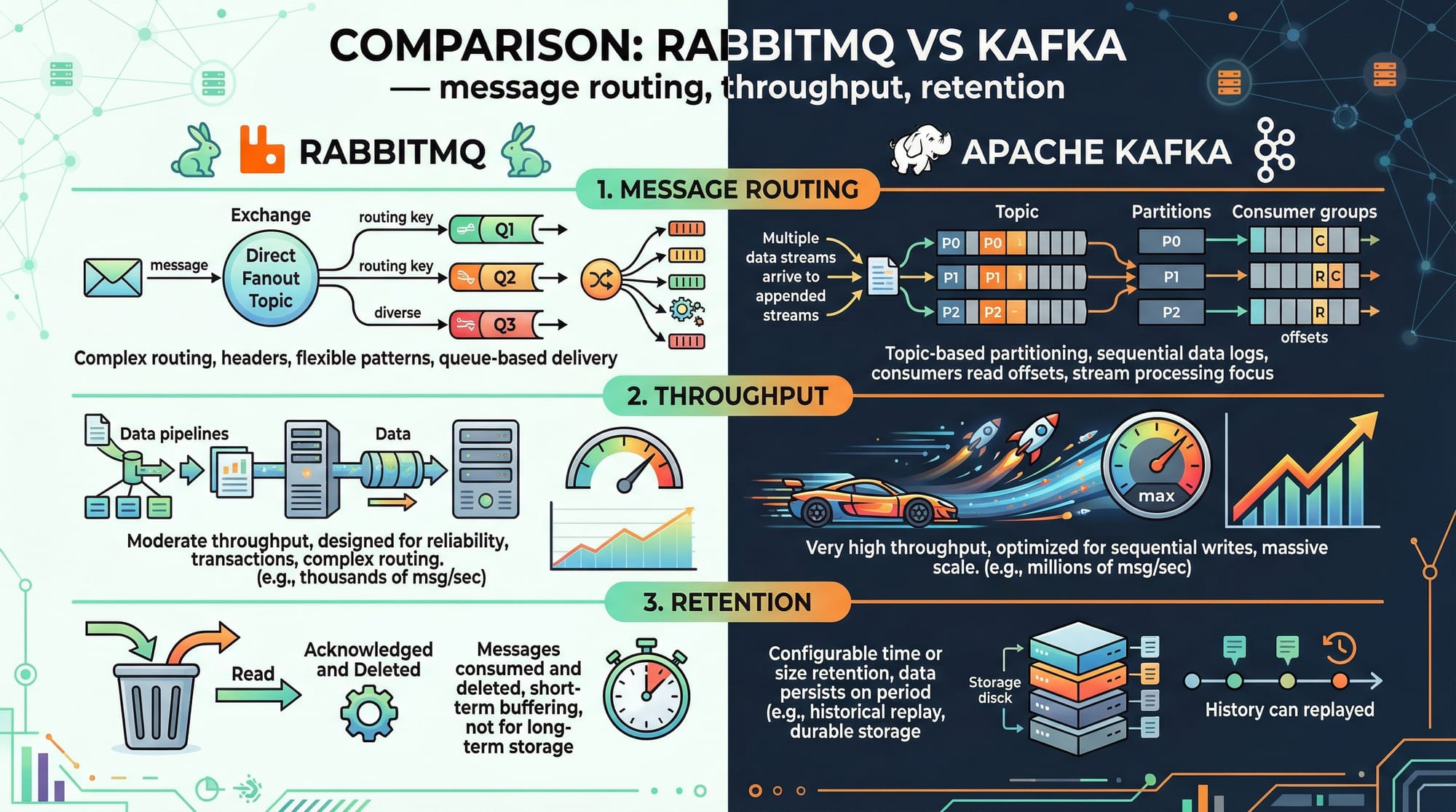 - RabbitMQ is suitable for reliable, routed messaging; Kafka is ideal for high-throughput streaming.