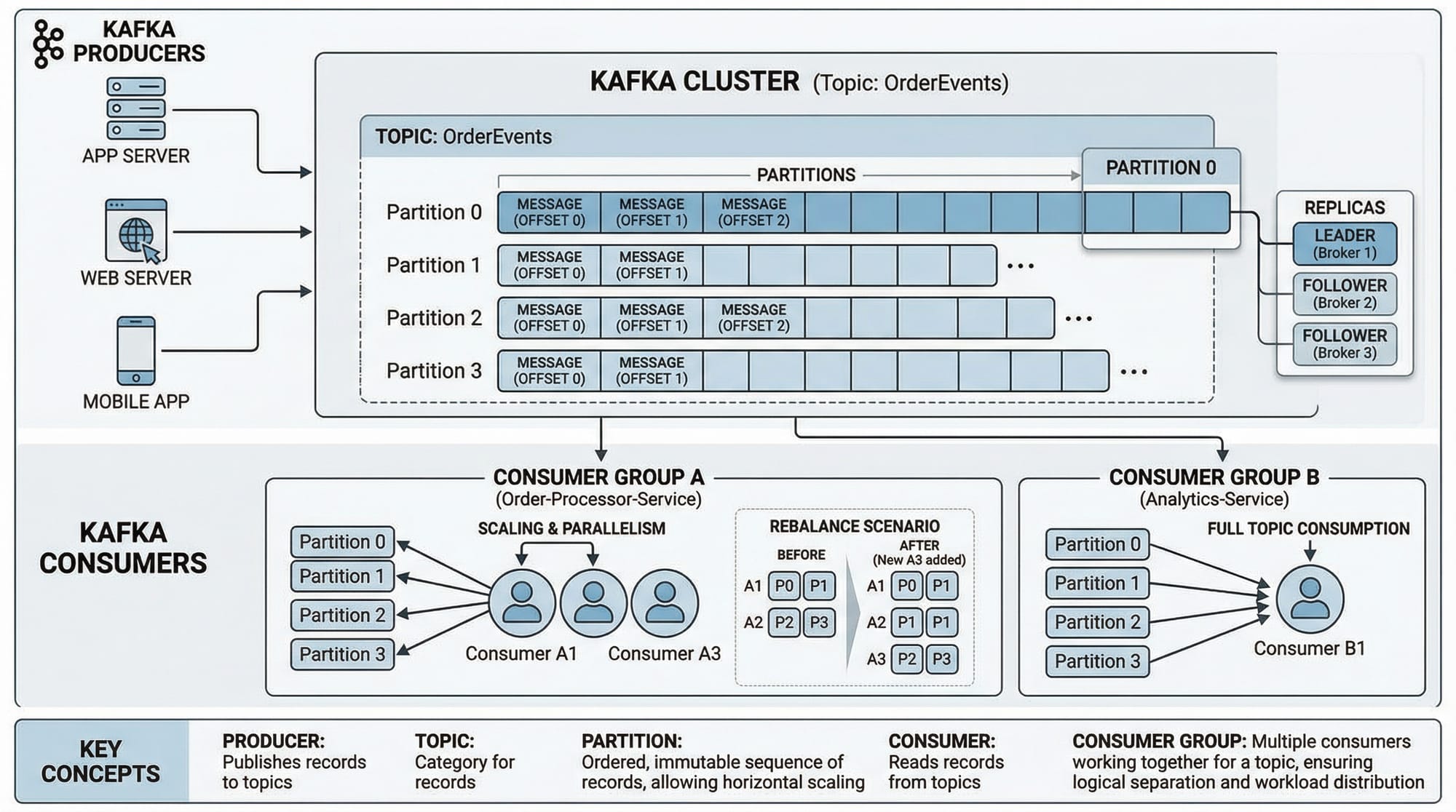 Many beginners expect Kafka to behave like RabbitMQ queues. Remember: Kafka stores messages in topics and partitions, and consumers maintain offsets.