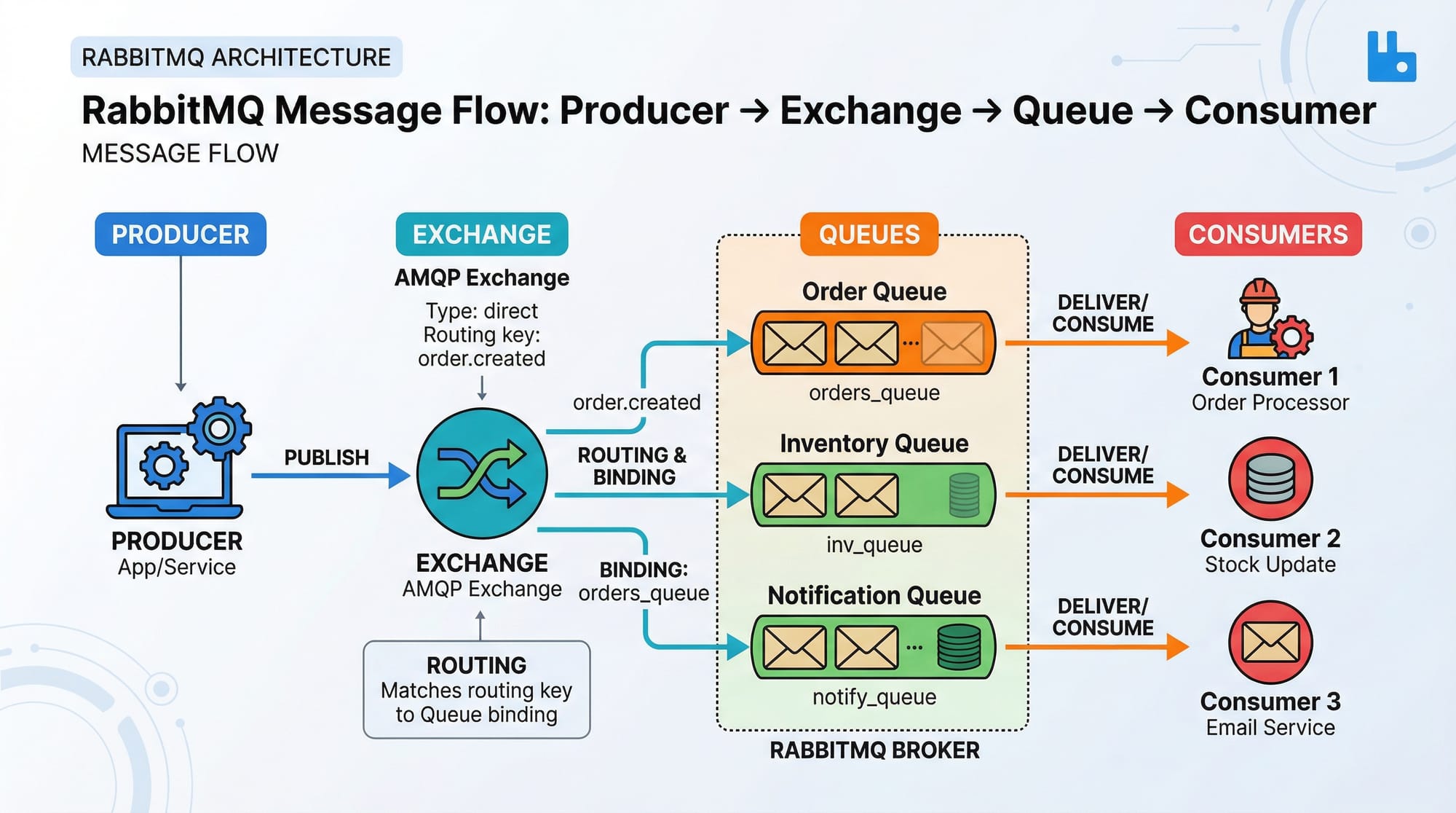 Ahmad in Lahore wants to send an order update to the logistics team. The producer (Ahmad’s app) sends the message to an exchange. The exchange routes it to the appropriate queue (logistics queue). The consumer (logistics service) receives the message asynchronously.