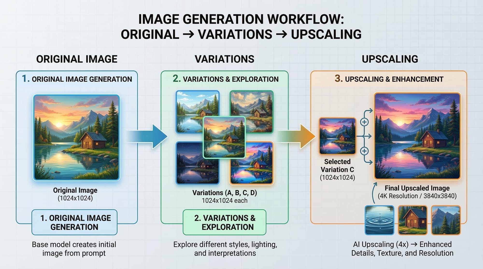 - Variations and upscaling help refine AI-generated visuals.