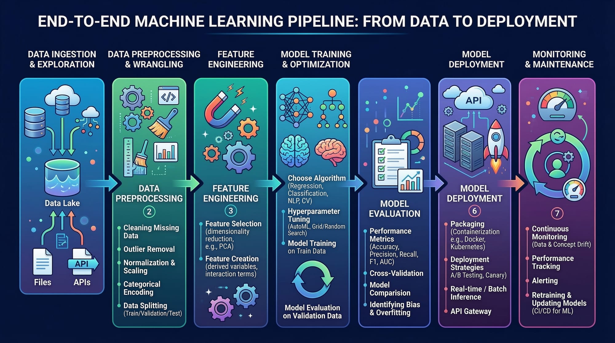 - Production ML pipelines automate preprocessing, inference, and monitoring.
