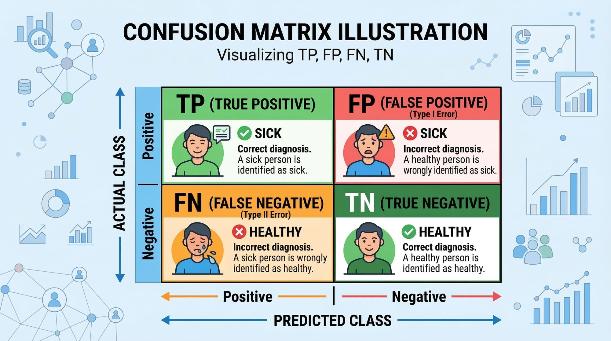 Evaluating a model ensures it generalizes well to new data. Key metrics include: