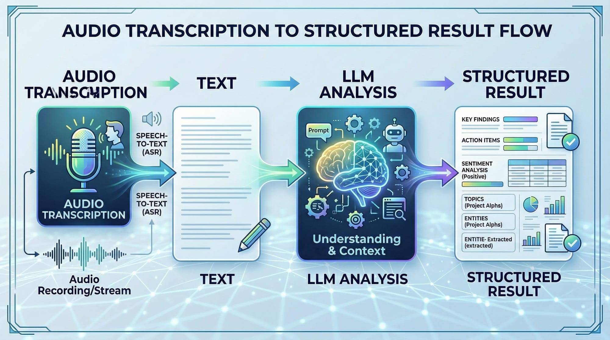 Audio processing allows LLMs to transcribe spoken content, understand sentiment, or extract structured data.