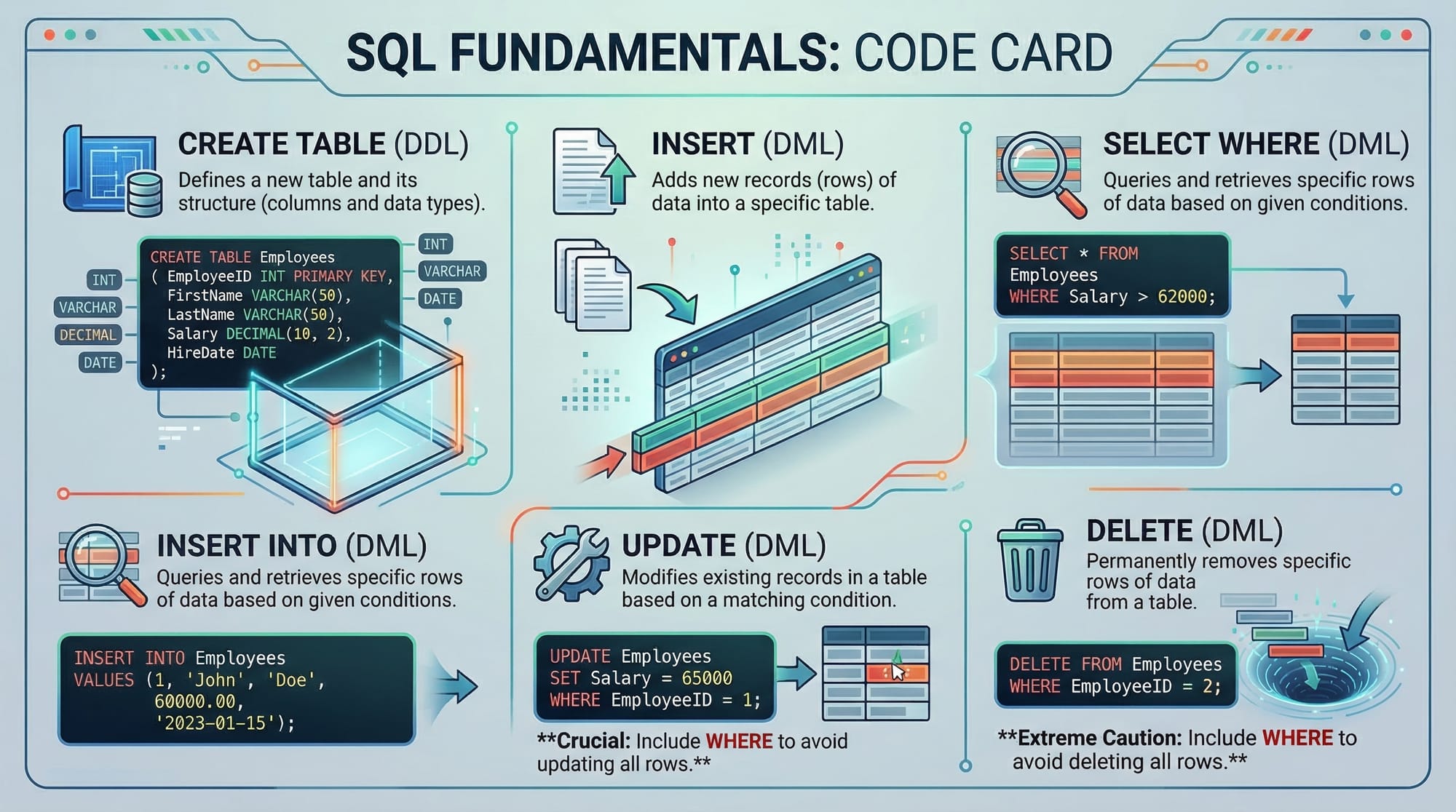 - CRUD operations (Create, Read, Update, Delete) form the backbone of MySQL usage