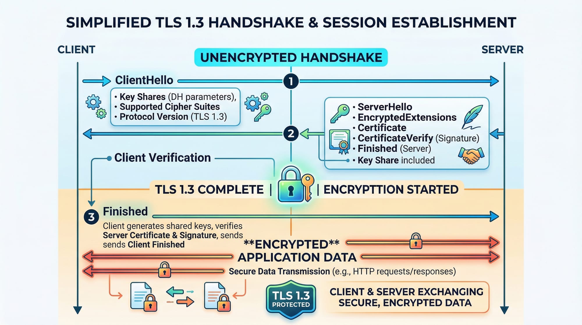 - ServerHello & Certificate – Server chooses method and sends SSL/TLS certificate.