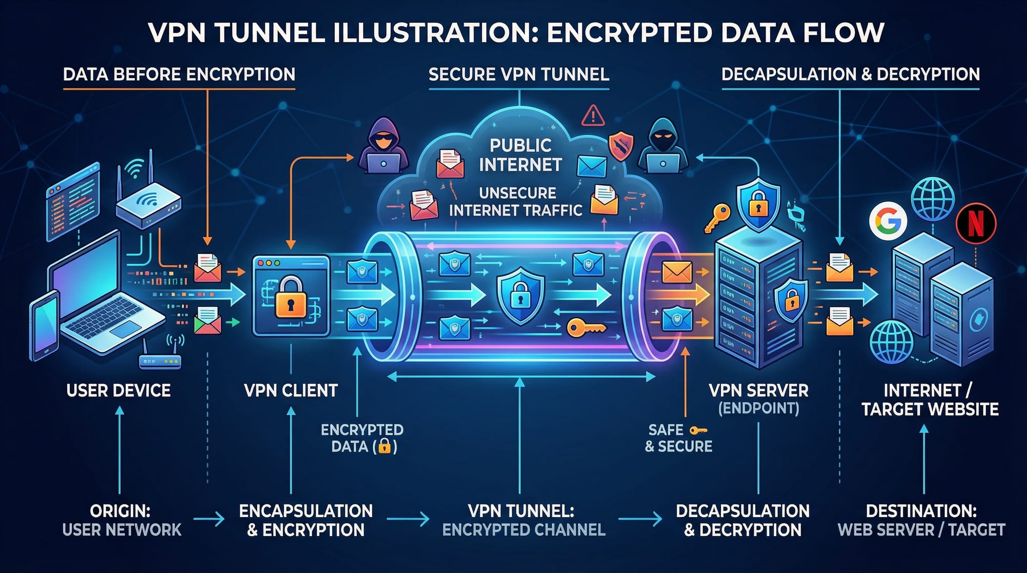 A Virtual Private Network (VPN) encrypts your internet traffic and routes it through a secure server, hiding your IP and location. VPNs are crucial for protecting personal data, especially when using public Wi-Fi in Karachi cafes.
