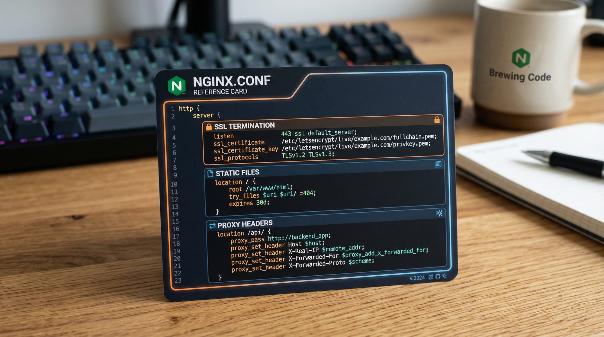 - Server Block: Defines the domain and listening port.