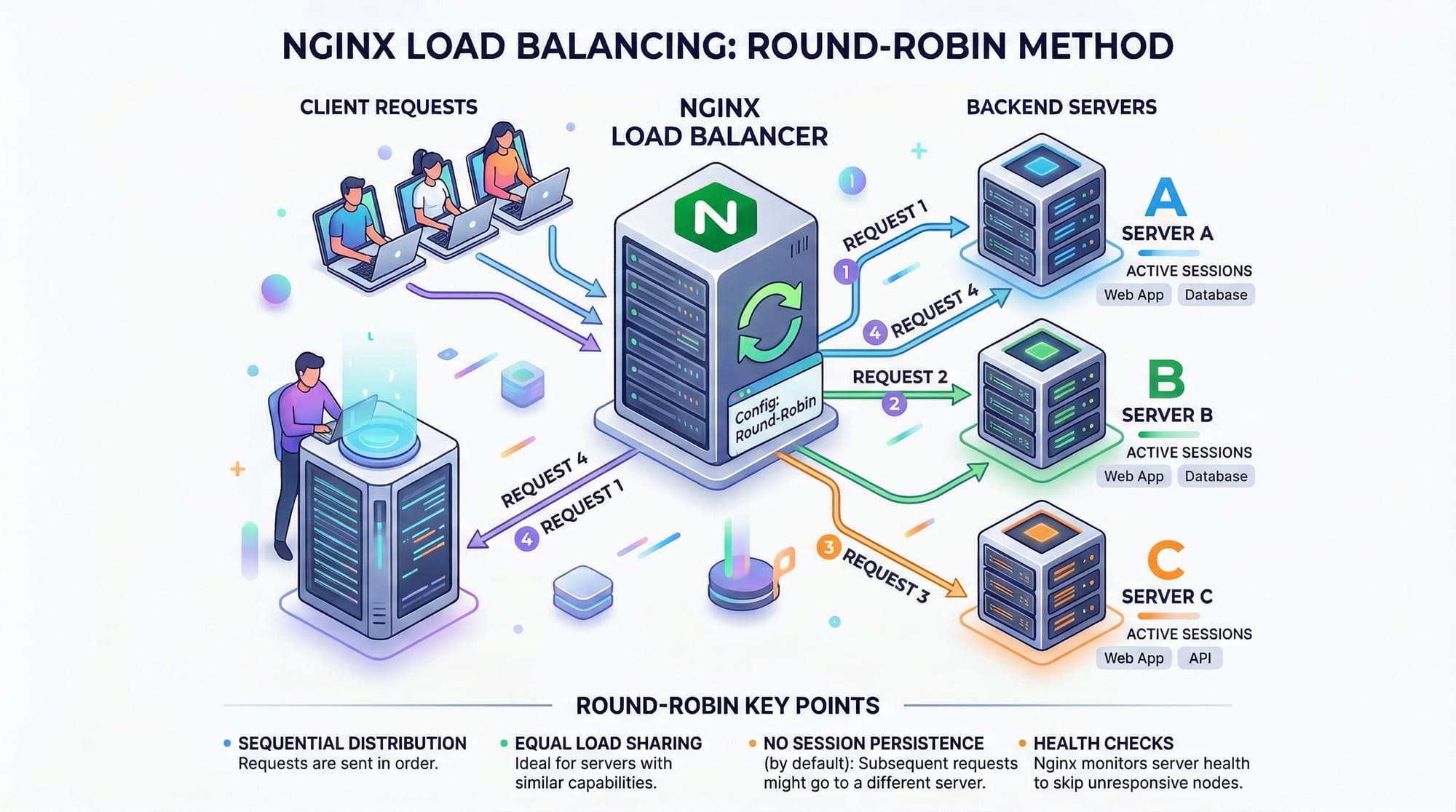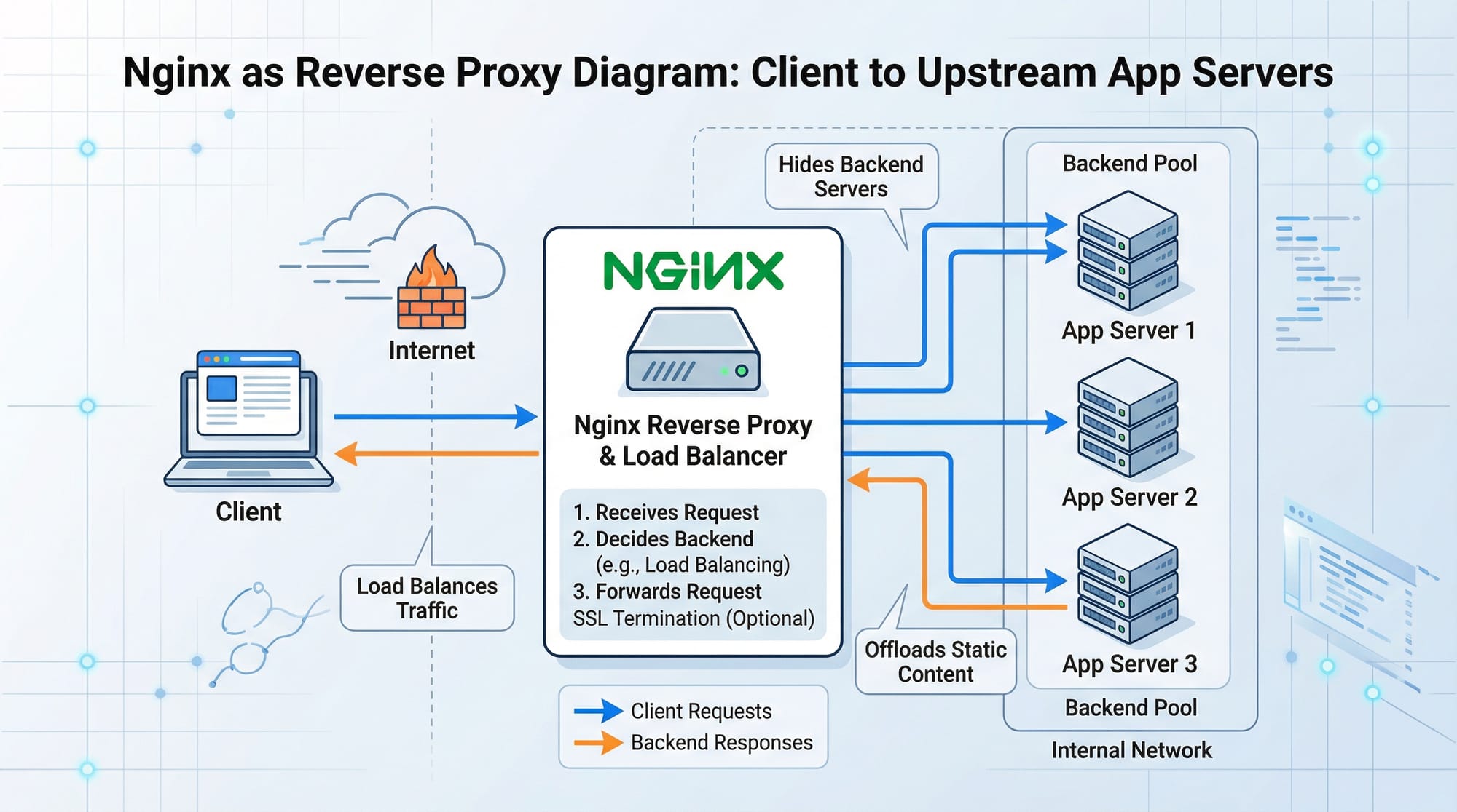 upstream backend_servers– Defines a group of backend servers.proxy_pass http://backend_servers;– Distributes requests in a round-robin manner by default.