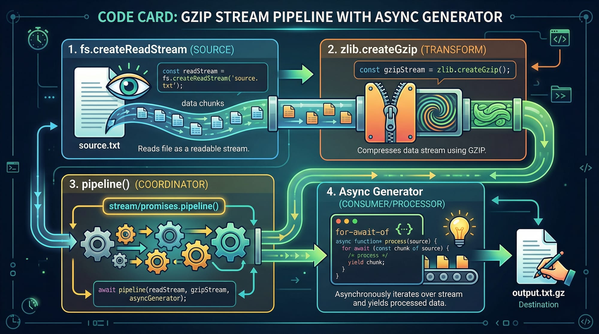 pipeline()function ensures safe stream composition with automatic error handling. - Real-world applications include file compression, CSV processing, and streaming video/audio.