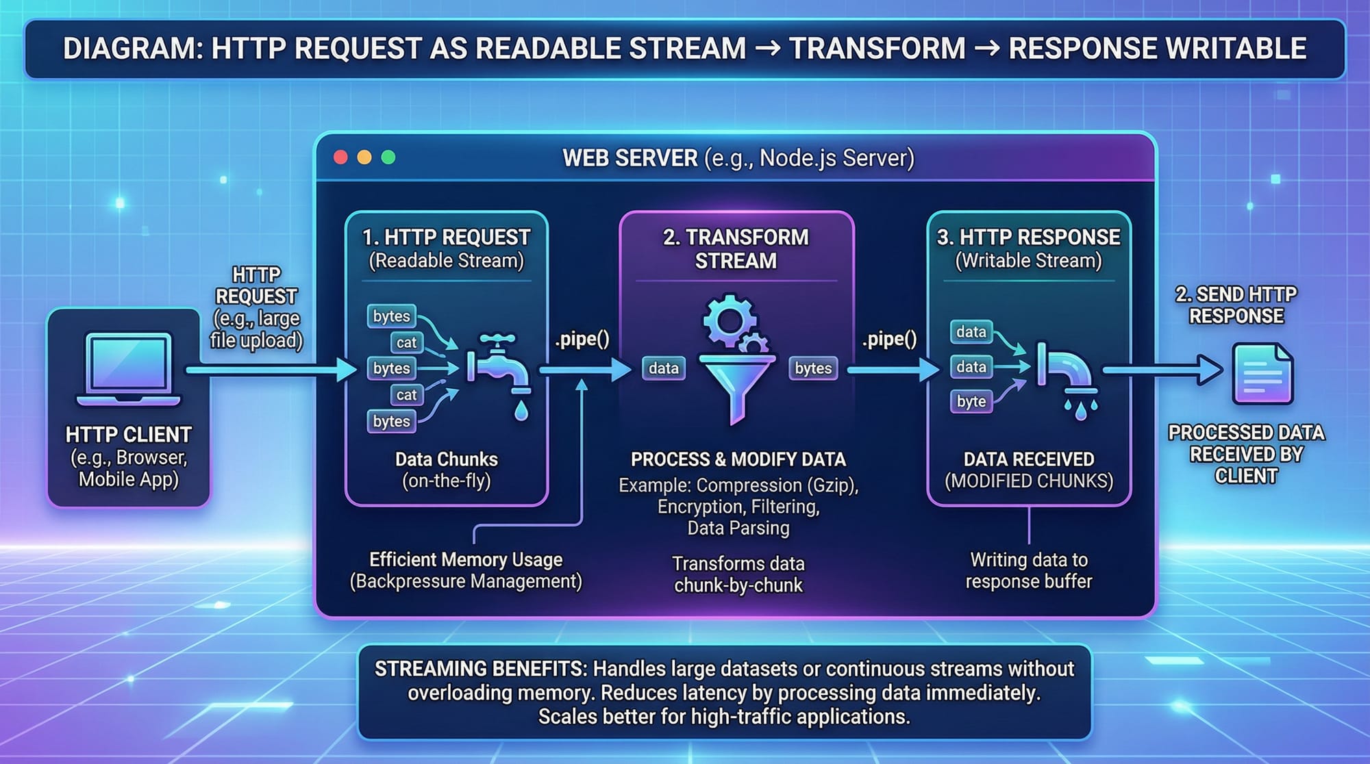 - Node.js streams allow chunked data processing, ideal for large files or real-time apps.