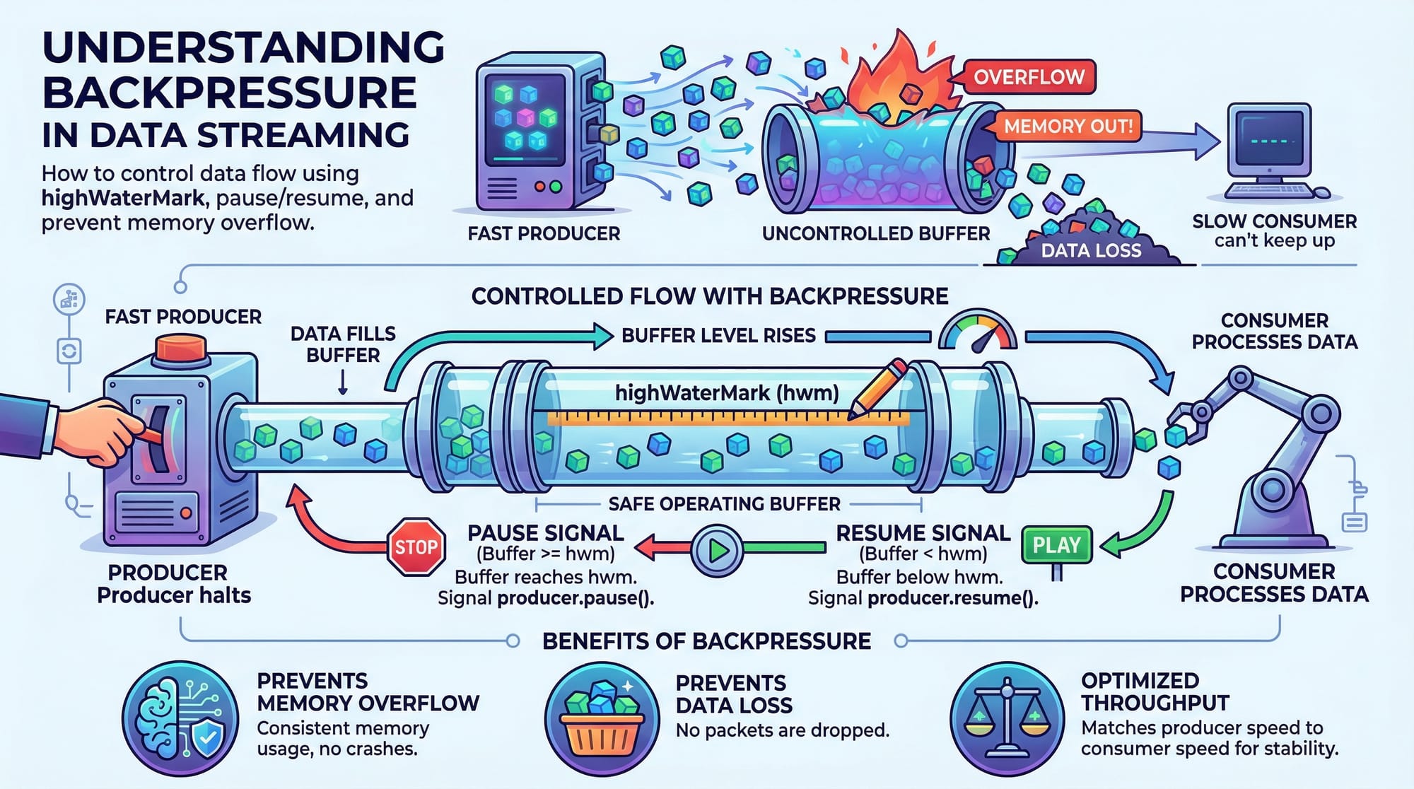 Backpressure occurs when the writable destination cannot handle the incoming data fast enough. Node.js streams handle it with pause() and resume() mechanisms to prevent memory overload.
