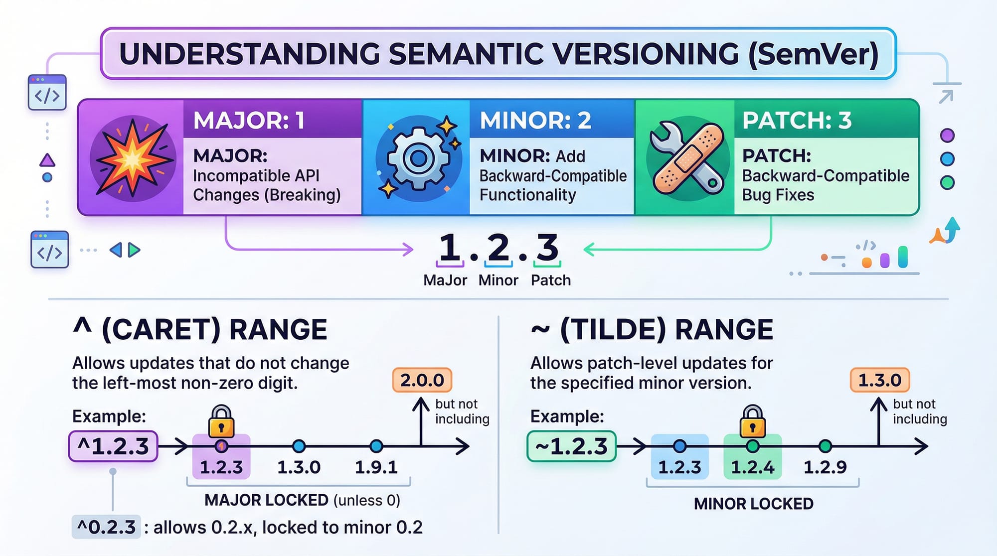 Example: Ali installs lodash with version ^4.17.21. The ^ ensures npm updates to any backward-compatible minor or patch version automatically.