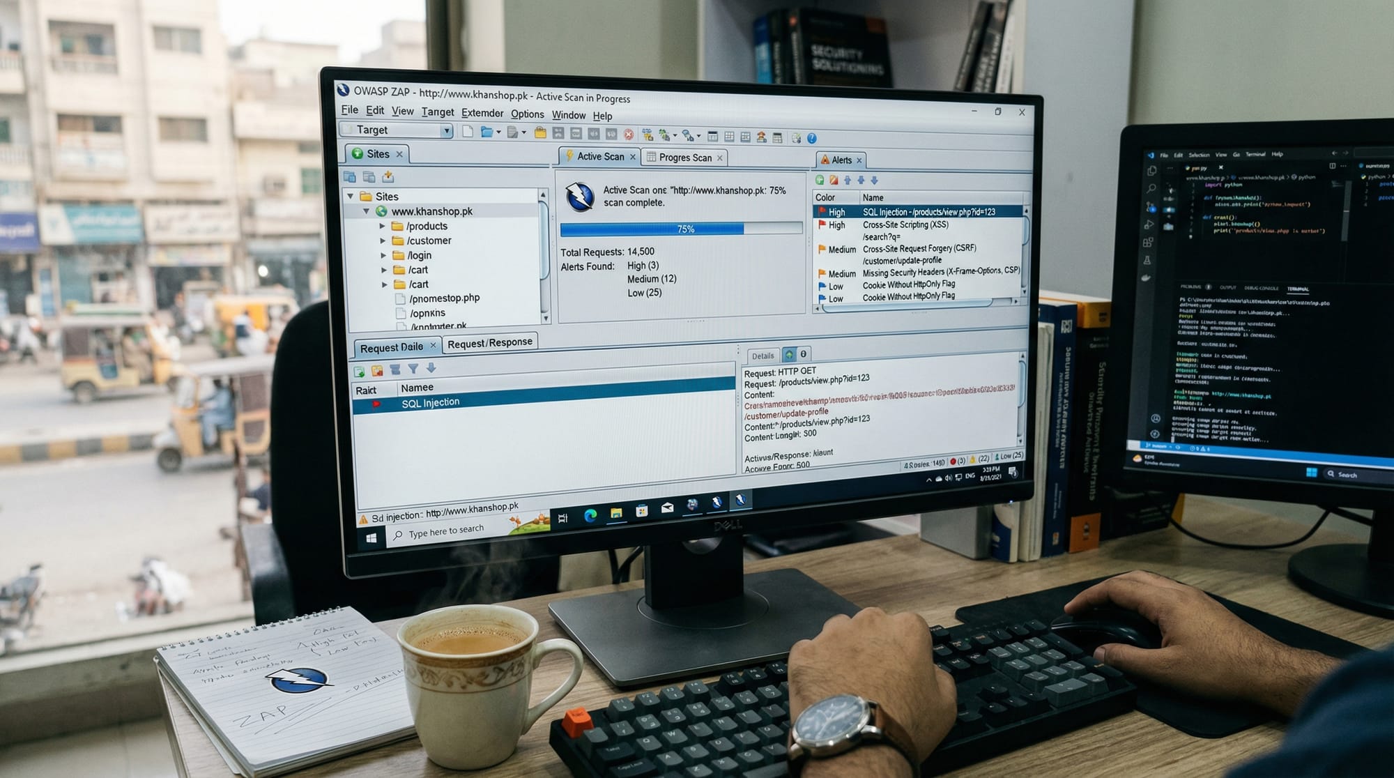 Fatima runs a scan on her college project portal in Islamabad. The spider explores all pages, while the active scanner tests for potential threats. The scan produces a report highlighting high-risk vulnerabilities like broken authentication.