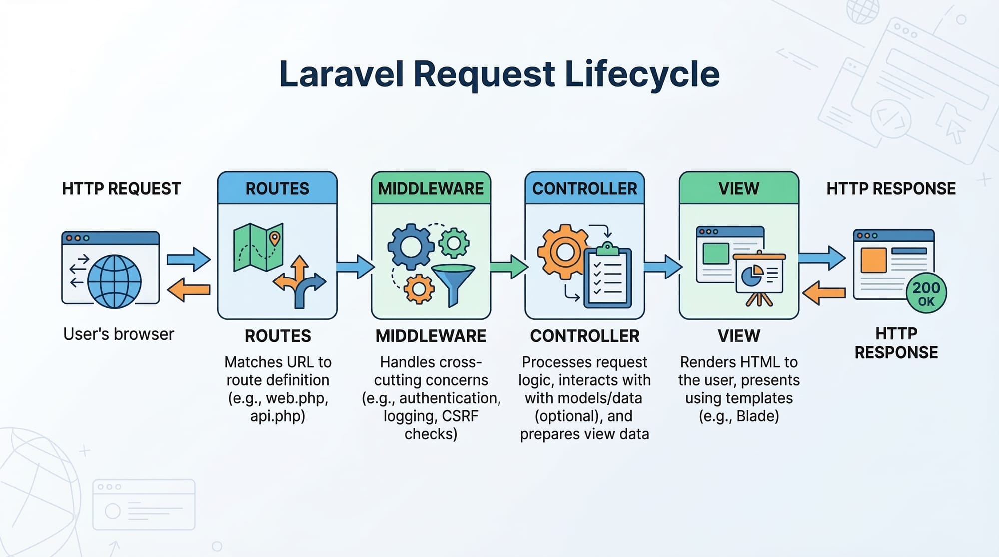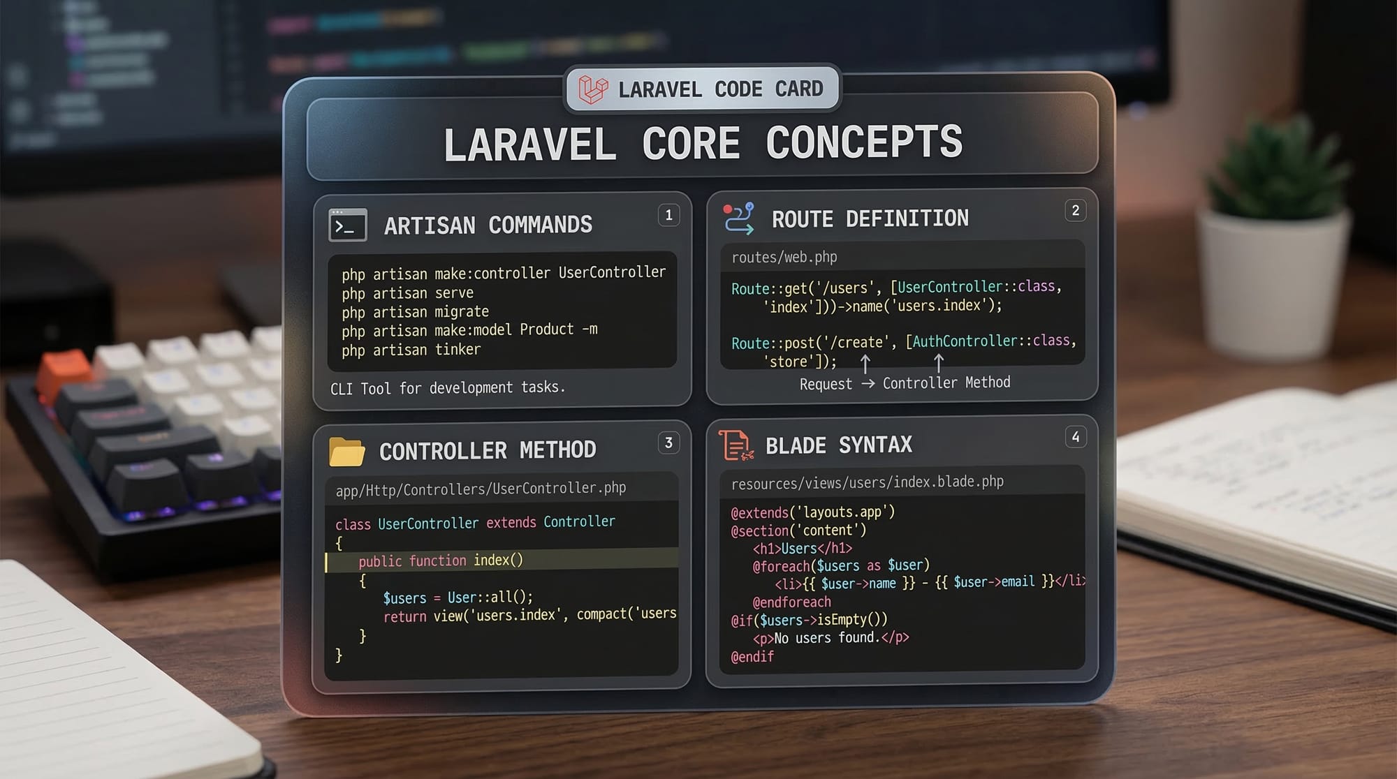 Laravel is structured around clean coding patterns and MVC architecture. Let’s explore the core concepts with examples.