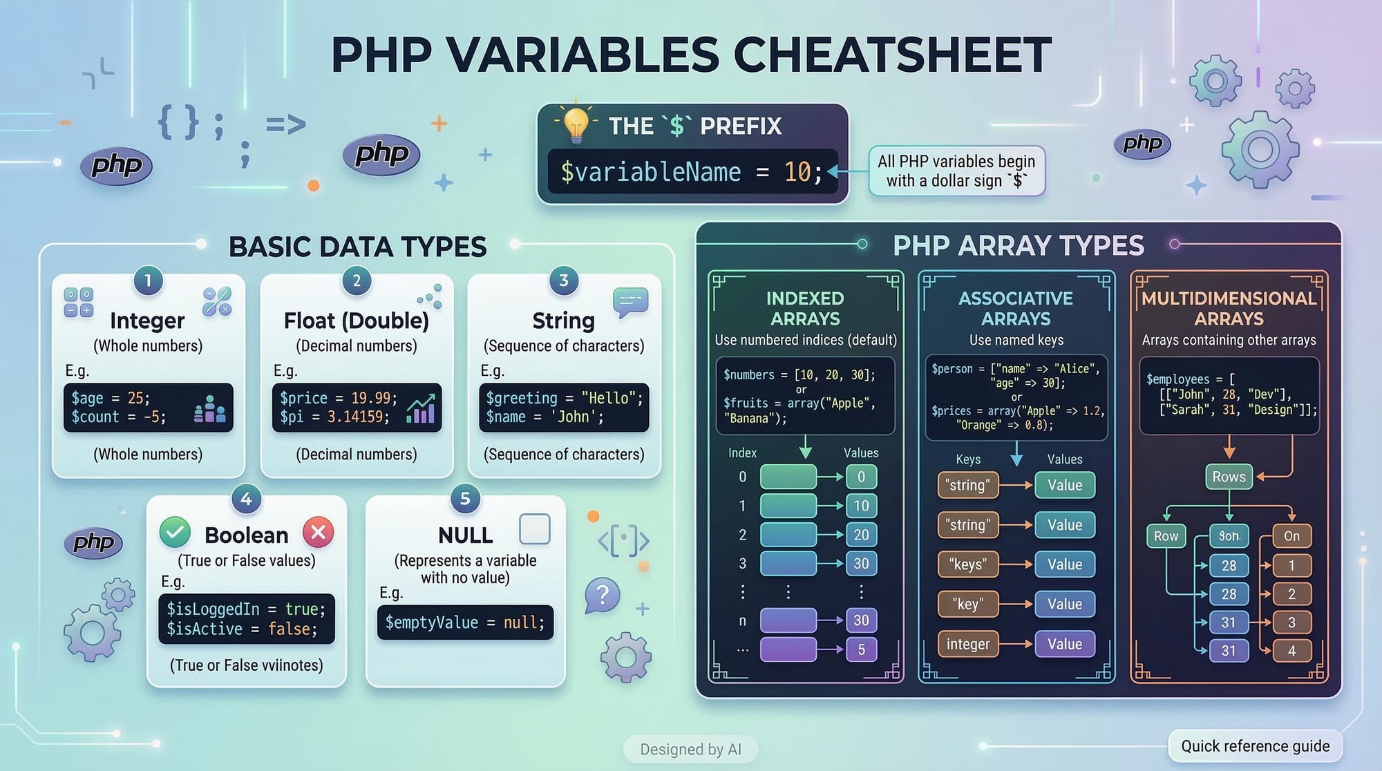 $name = "Ahmad";→ Stores a string.$age = 21;→ Stores an integer value.$balance = 1500.50;→ Stores a float representing PKR balance.$isStudent = true;→ Stores a boolean indicating student status.