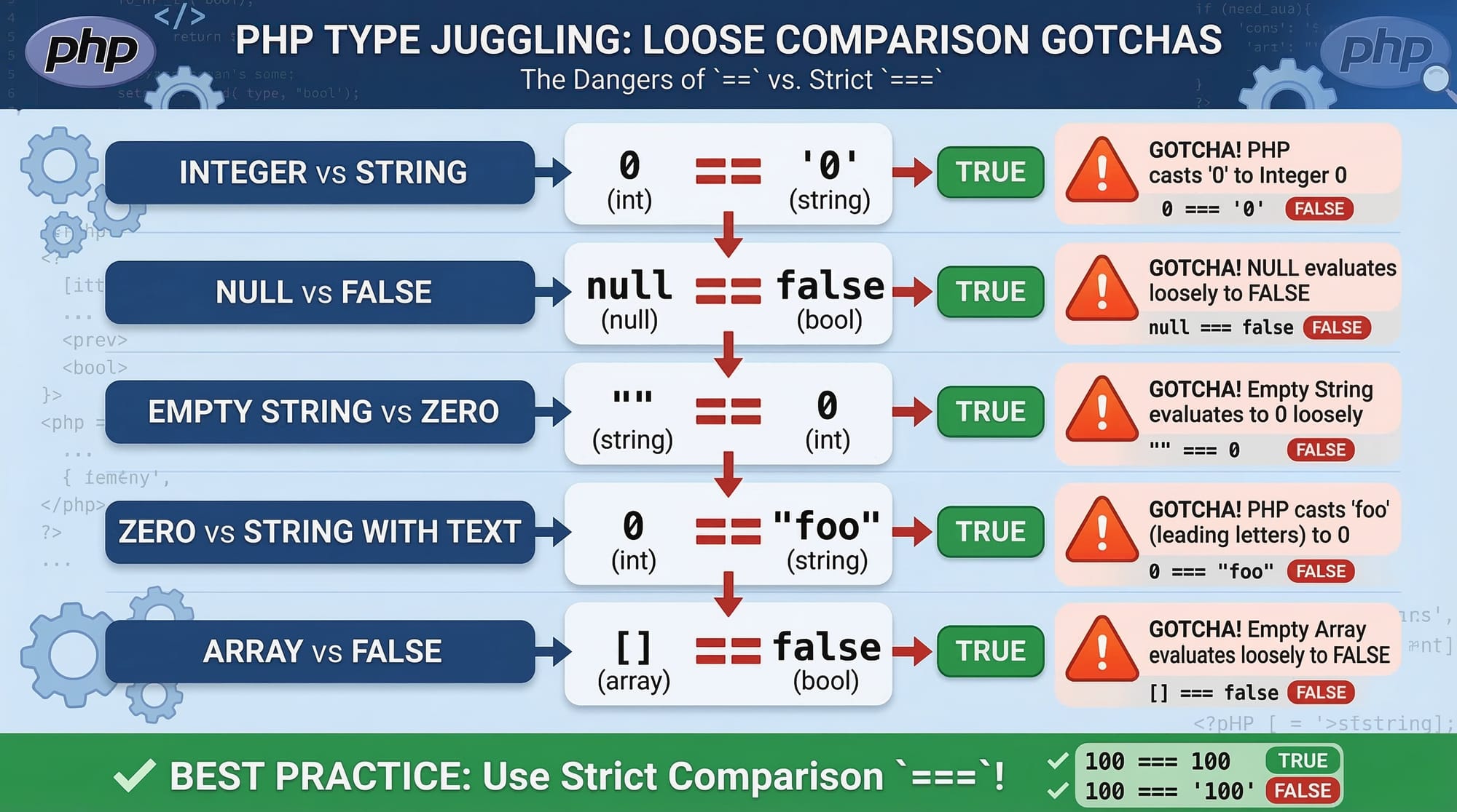 Fix: Use === for strict comparison to avoid type juggling errors.