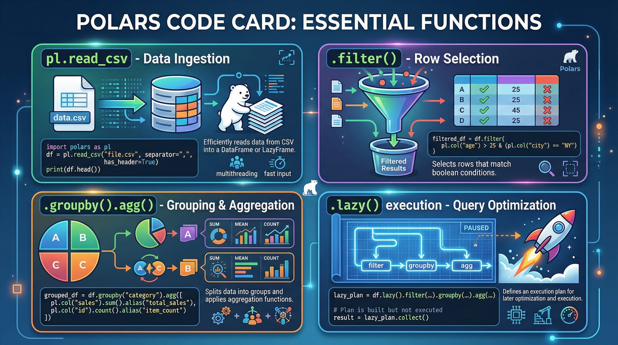 df.lazy()— Converts the DataFrame into a lazy object..filter()— Sets the condition for filtering rows..groupby("month")— Groups data by themonthcolumn..agg()— Aggregates using the mean temperature..collect()— Executes the entire query efficiently.