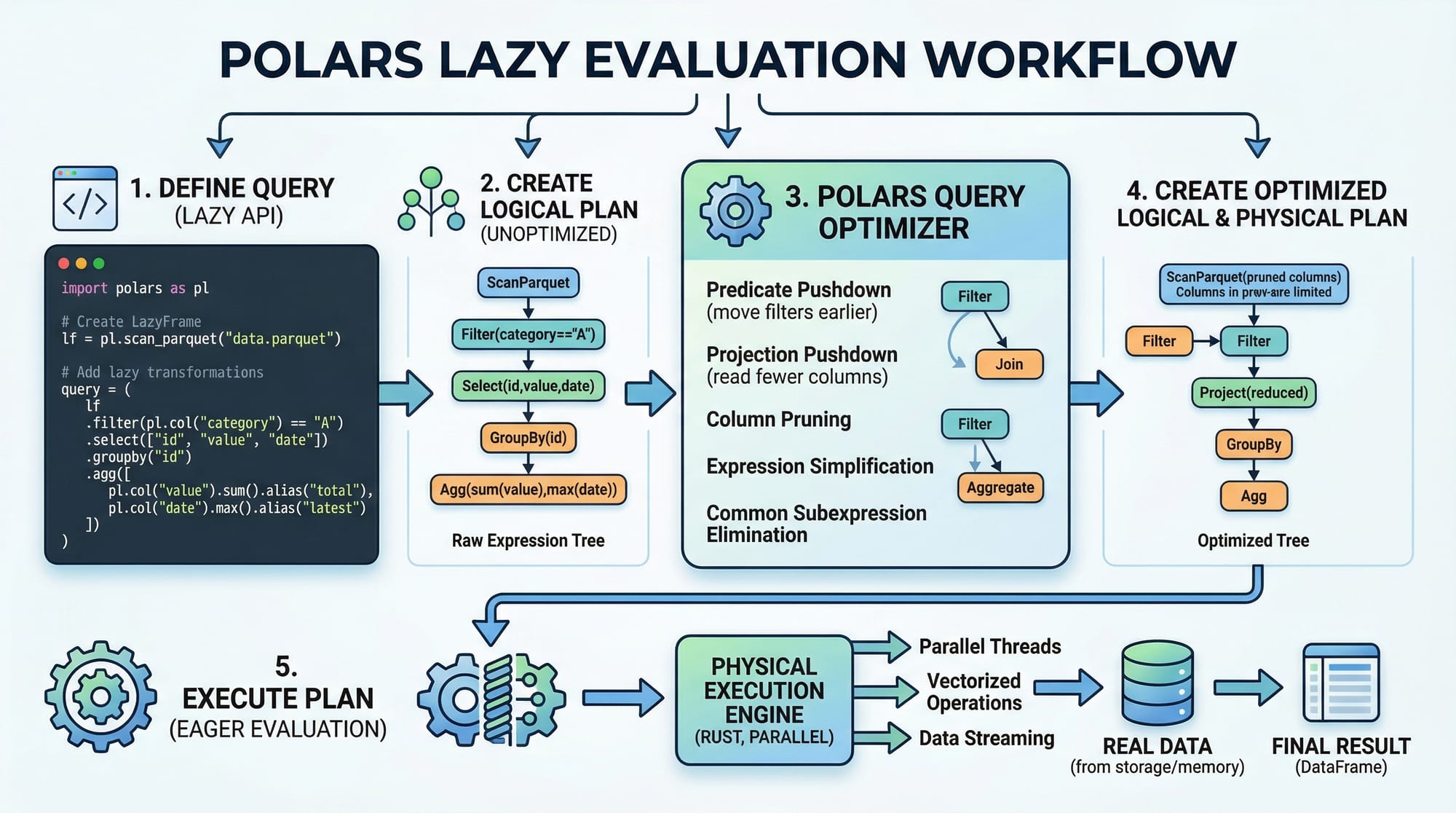 Polars supports lazy execution, allowing multiple operations to be optimized before actual computation.