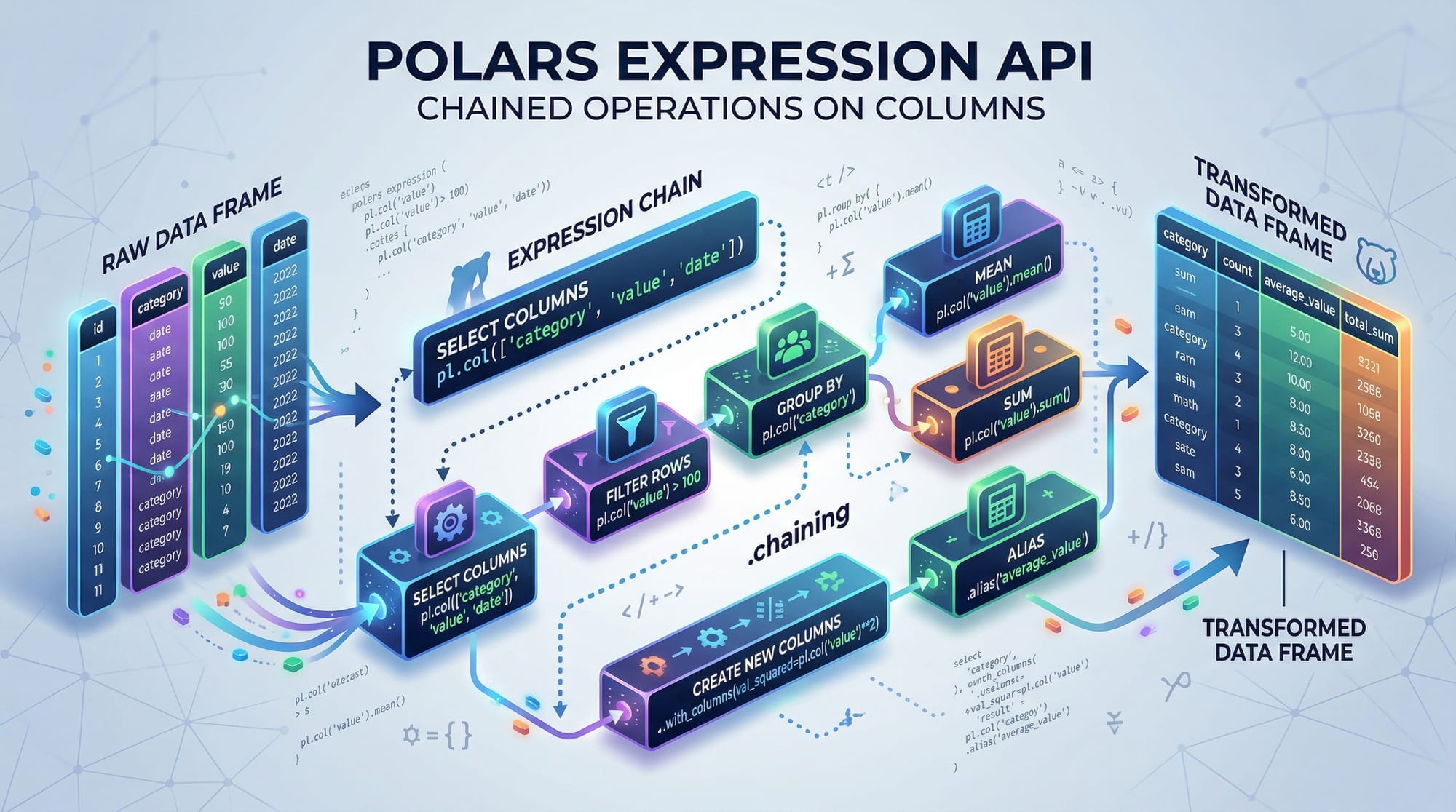 Polars uses expressions to perform operations on columns efficiently. For example: