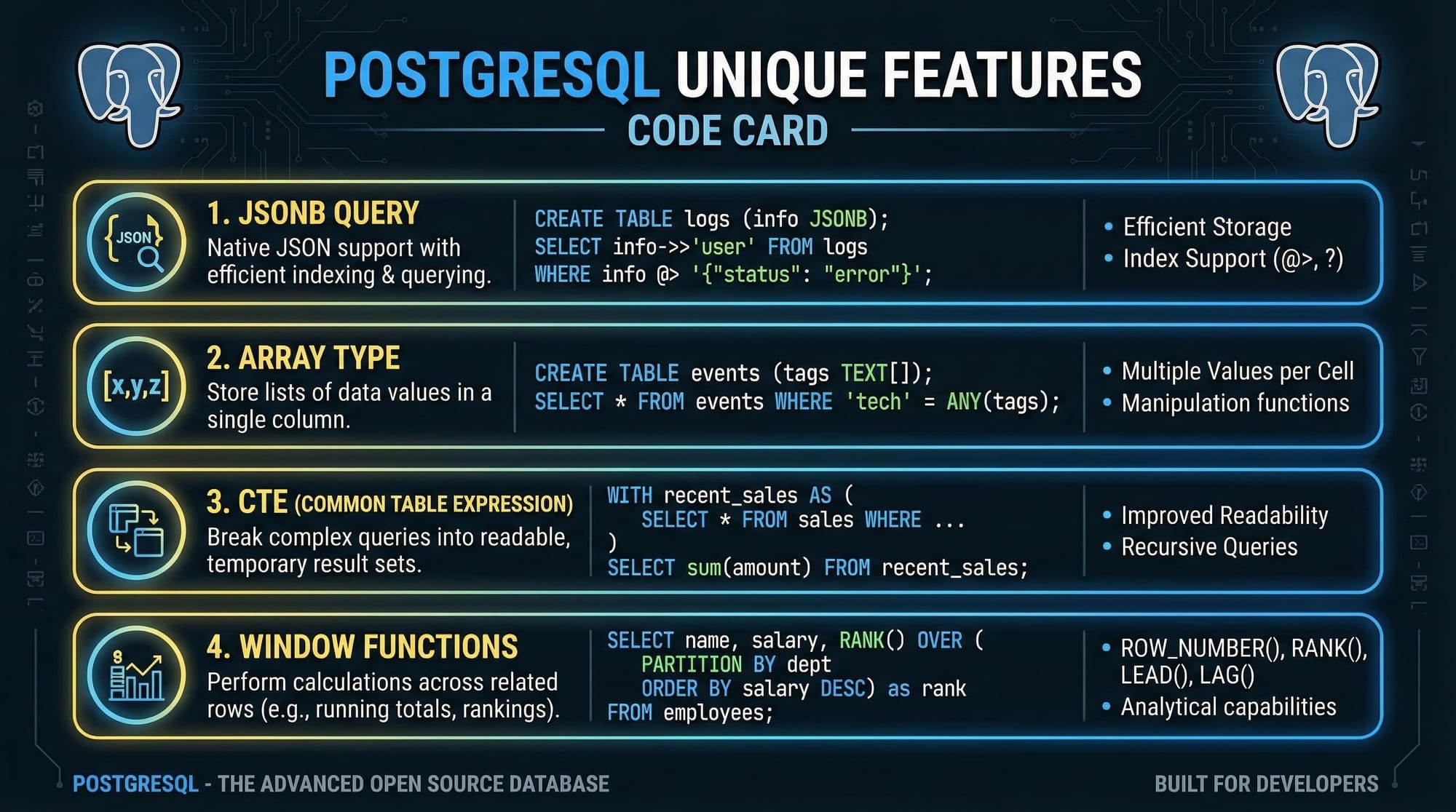 - Supports advanced SQL features like JSONB, arrays, CTEs, and window functions.