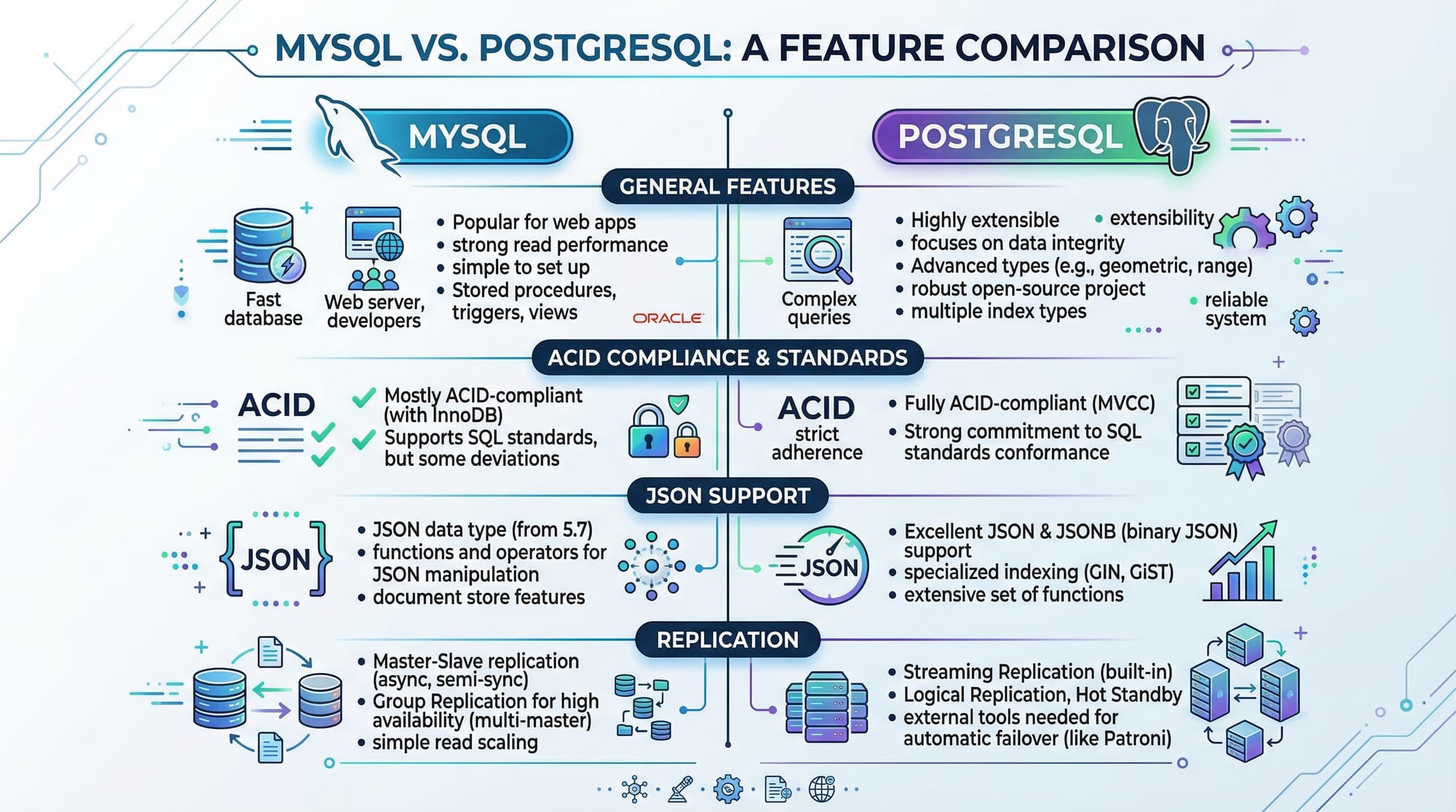 PostgreSQL is fully ACID-compliant, supports JSONB and array types, and has advanced indexing and querying capabilities. MySQL is simpler and more widely used in shared hosting.