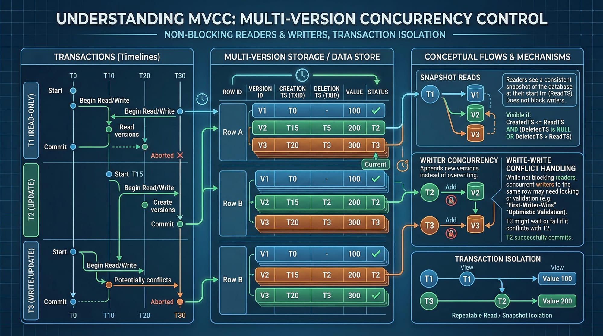 - MVCC (Multi-Version Concurrency Control): Allows multiple users to read/write data without blocking.