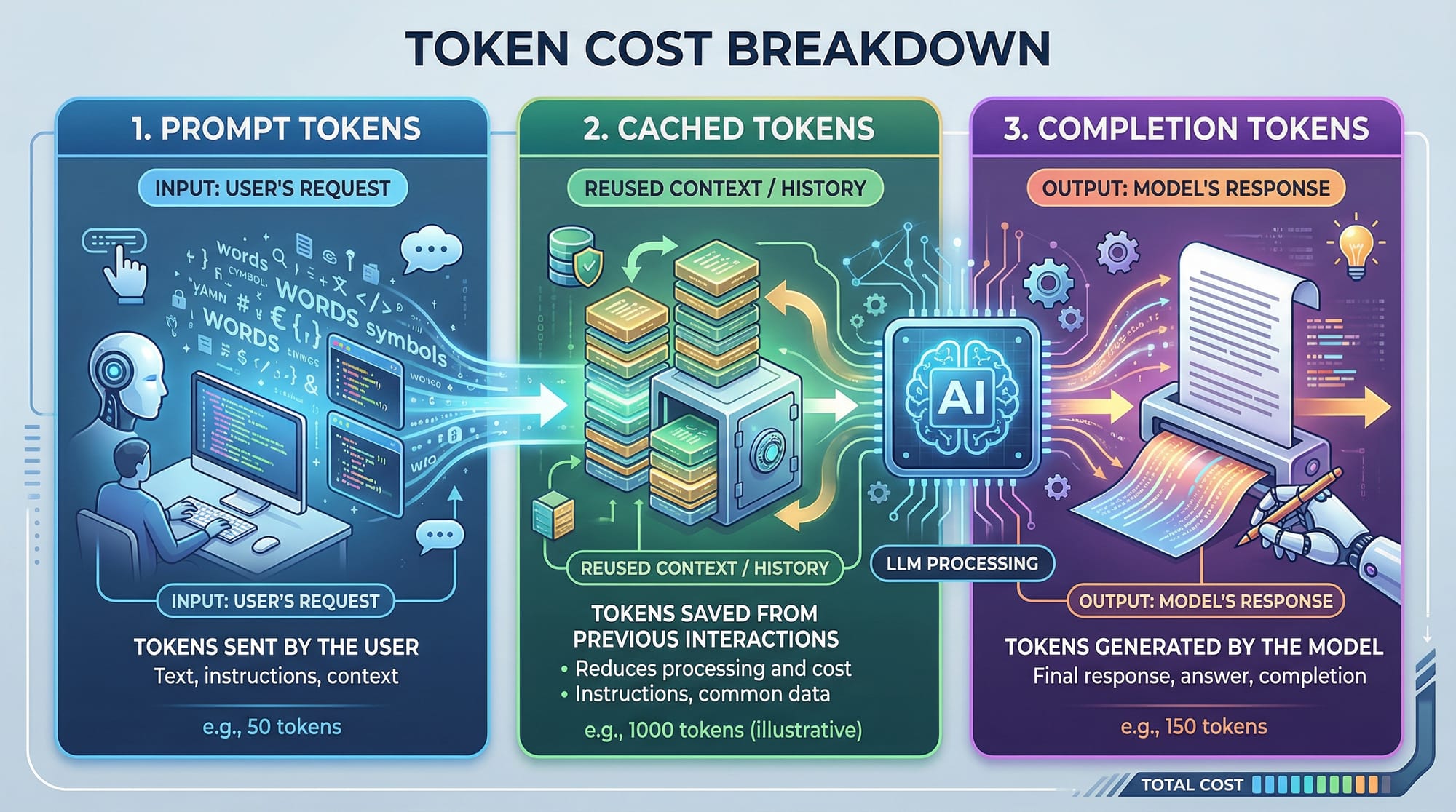 LLMs charge based on the number of tokens processed: prompt tokens + completion tokens. Prompt caching helps optimize this.