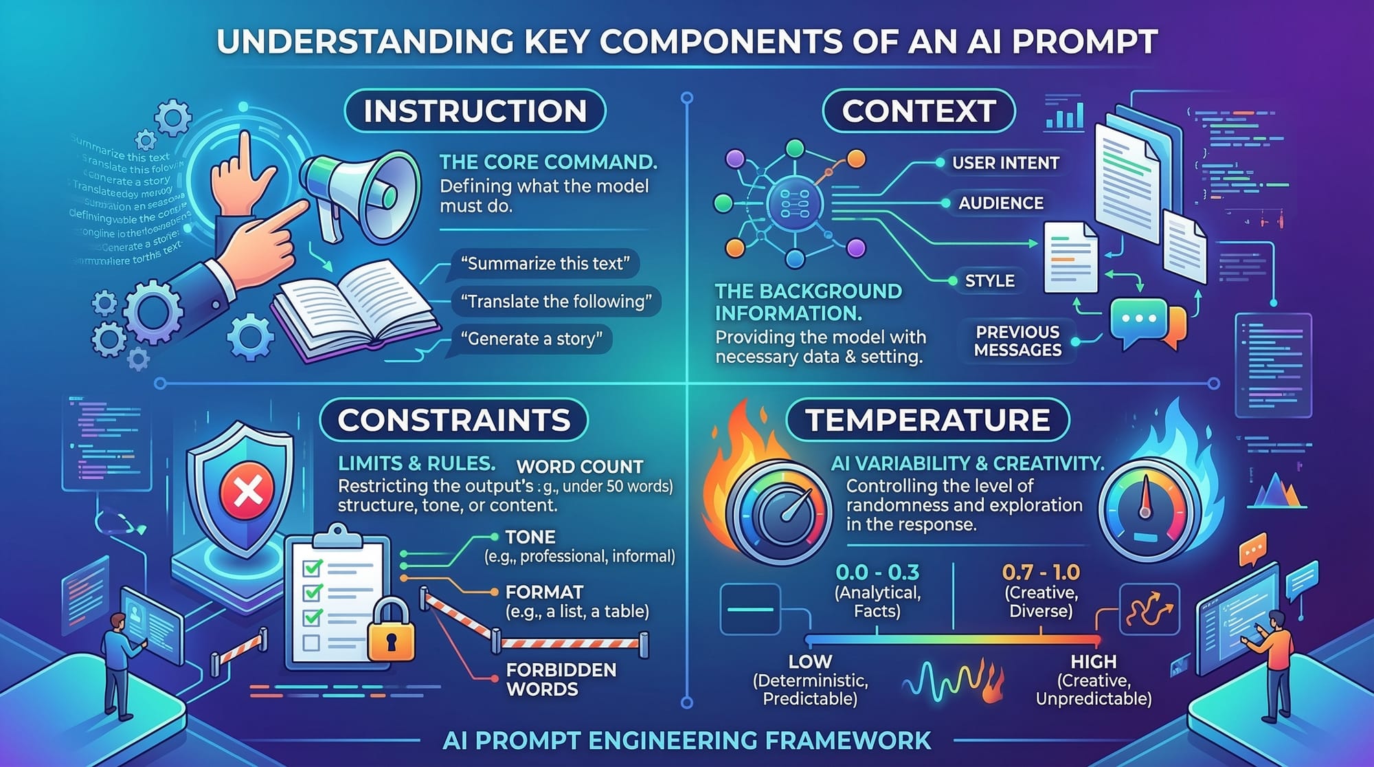 Here, the instruction defines the task, the context adds local flavor, and constraints ensure the output meets requirements.
