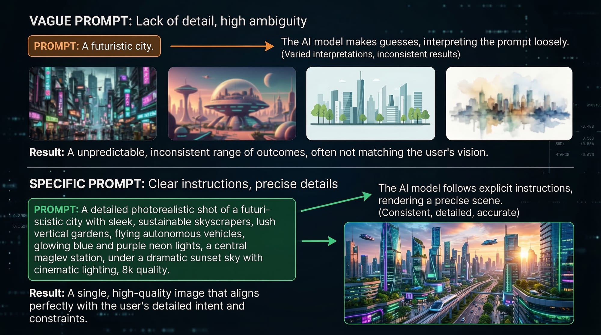 A prompt is a command or query you give to an AI model. The clarity, structure, and context of your prompt determine the quality of the AI-generated content.