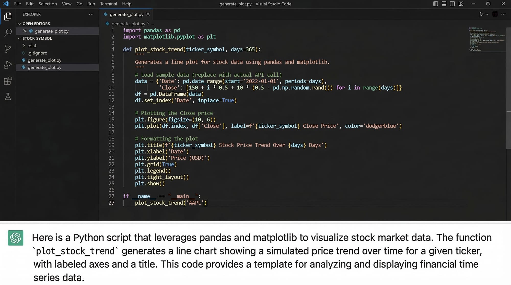 import openai– Import the OpenAI library to access the API.openai.api_key = "YOUR_API_KEY"– Securely authenticate your API access.prompt_text– Define the instruction for the AI.openai.Completion.create()– Generate content using the AI model.print(response.choices[0].text)– Display the AI output.