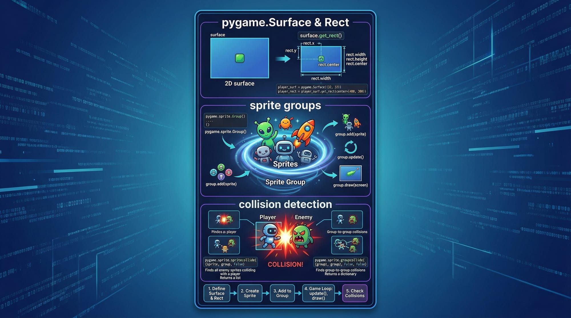 colliderect()→ Returns True if rectangles overlap- Used in games like catching coins or avoiding enemies