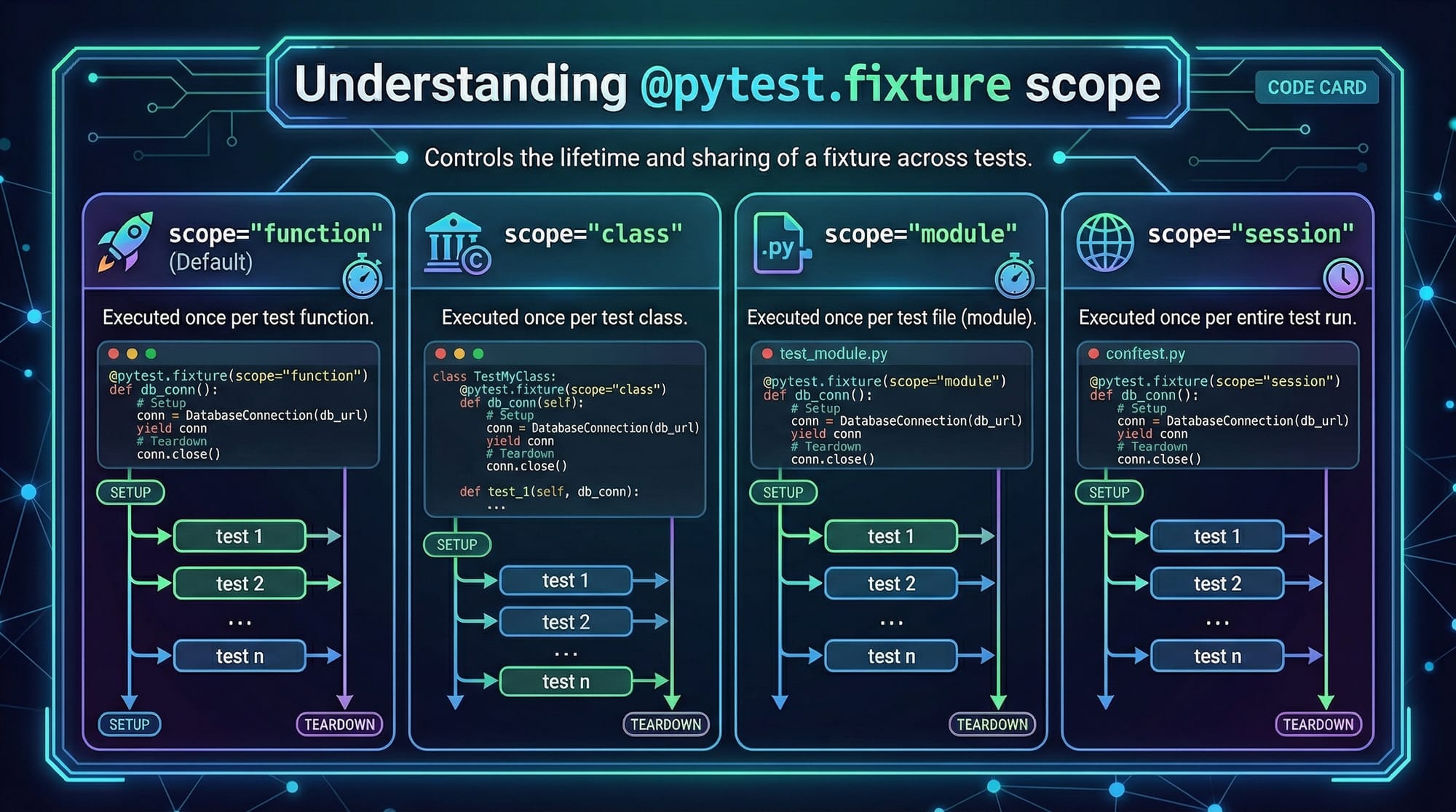 @pytest.fixture– markssample_listas a fixture.def sample_list()– returns a reusable list for tests.test_list_sum(sample_list)– pytest injects the fixture into the test function automatically.