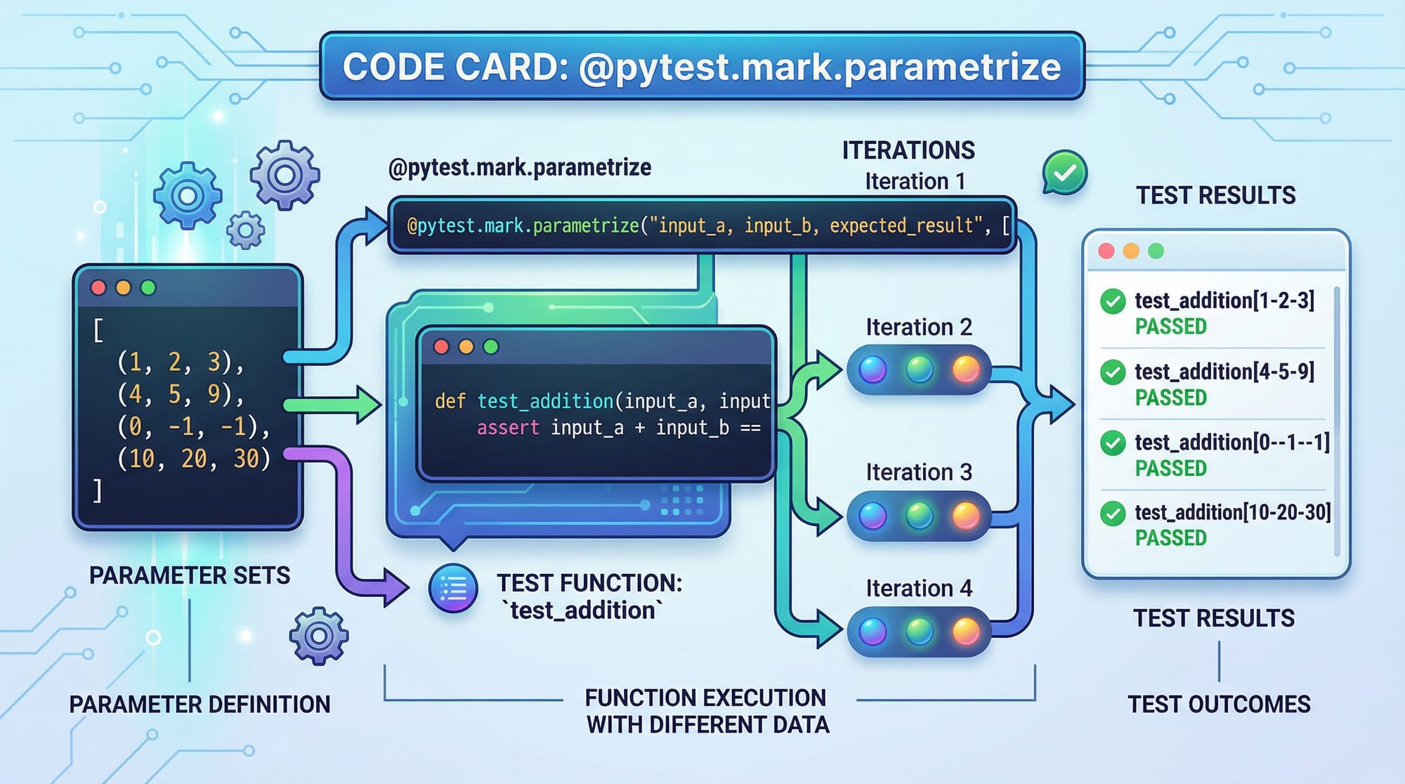 @pytest.mark.parametrize– runstest_squaremultiple times with different values.num, expected– arguments for each test iteration.assert num**2 == expected– validates that the square calculation is correct.