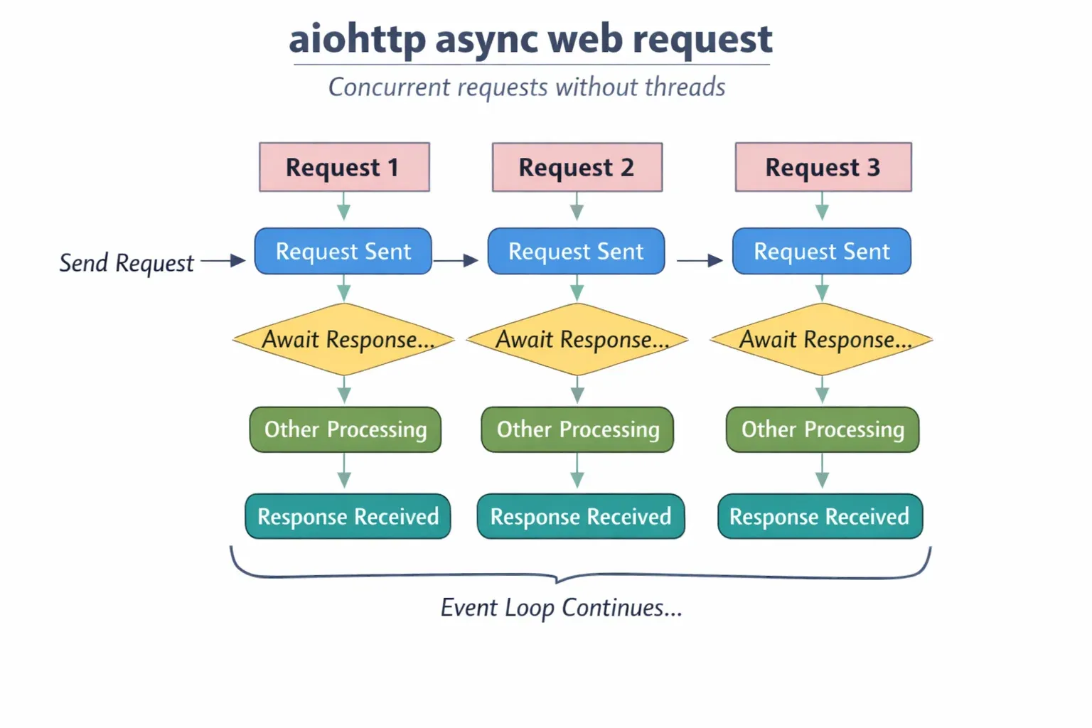 aiohttp— Async HTTP client- Each city fetch is a coroutine
