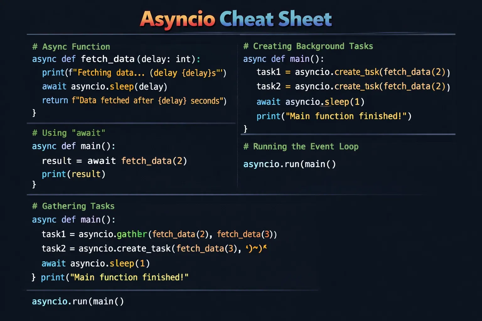 async defto define coroutines andawaitto pause execution. asyncio.create_taskandasyncio.gathermanage multiple tasks efficiently.- Avoid blocking code inside async functions; prefer