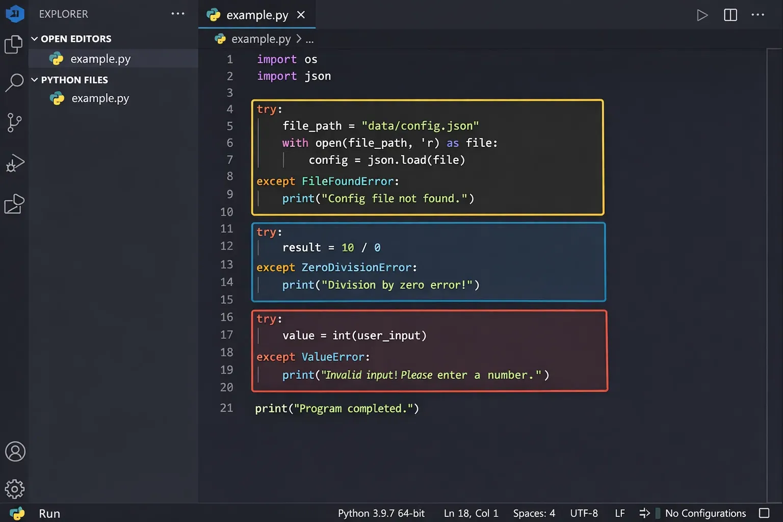 elseclause keeps your code clean. Useelseto separate your "happy path" logic from your error handling, making both easier to read. - Create custom exceptions for meaningful code. In larger projects, custom exception classes with descriptive names and helpful messages make your API far easier to use and debug.