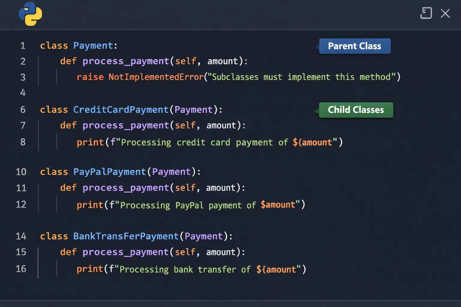 To deepen your OOP knowledge, check out our Python Abstract Classes and Interfaces tutorial — you will learn how to enforce method overriding using ABC and @abstractmethod, taking polymorphism to the next level.