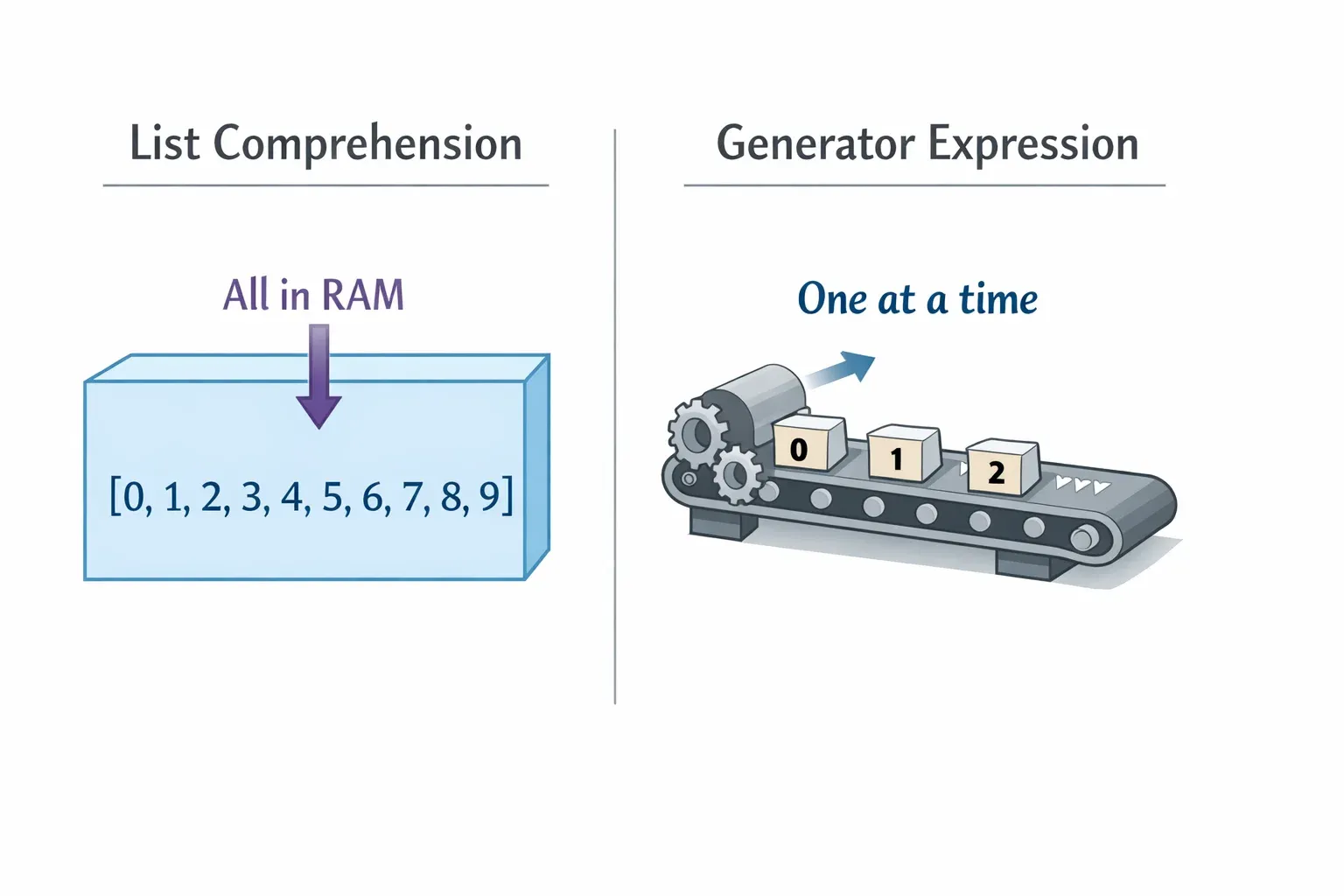 The crucial difference is in how memory is used. A list comprehension builds the entire list and stores it in memory immediately. A generator expression creates a generator object that produces values one at a time, only when you ask for the next one. This is called lazy evaluation.
