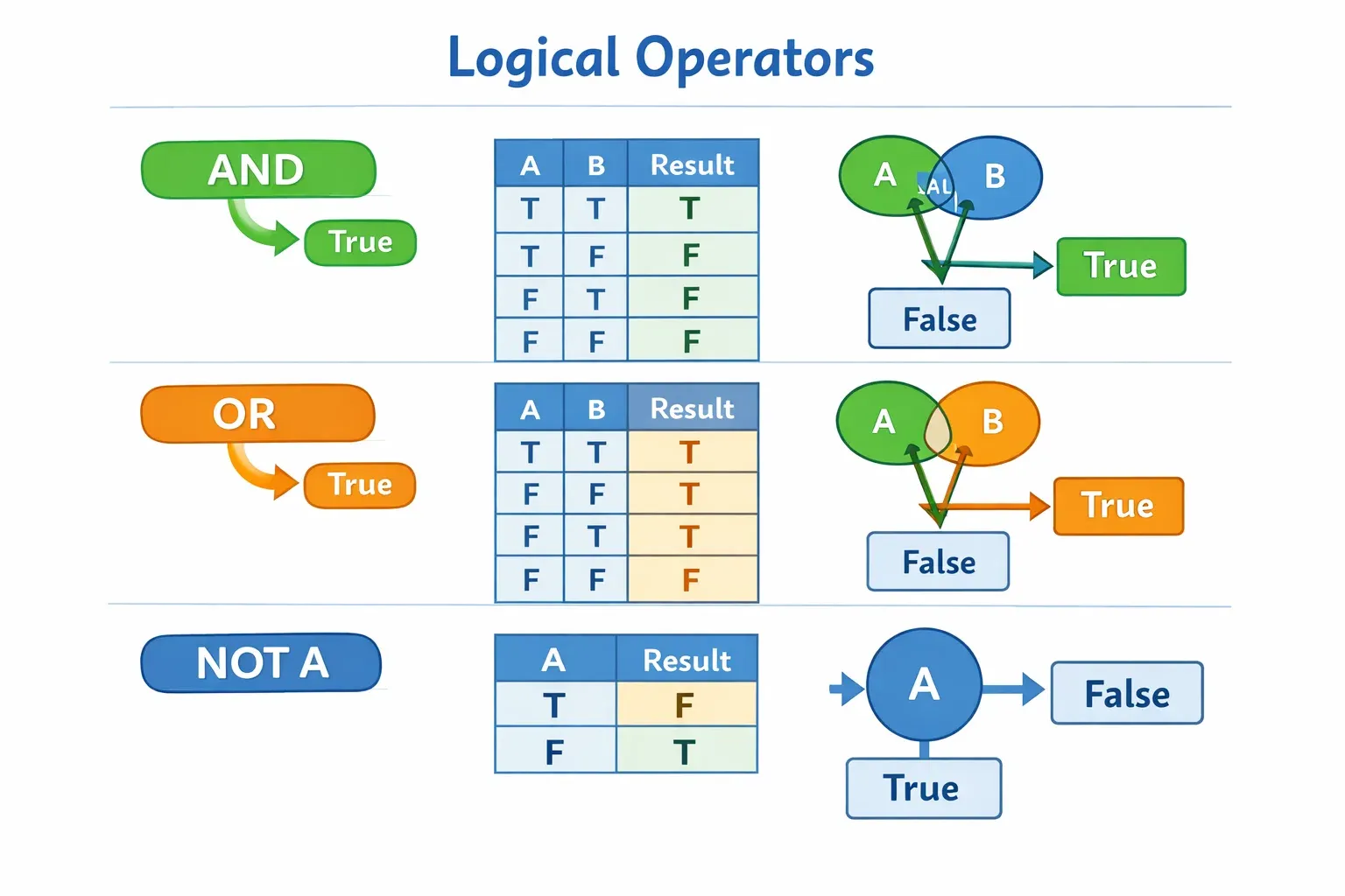 ==,!=,>,<,>=,<=) compare two values and always return a Boolean (TrueorFalse). Never confuse=(assignment) with==(comparison). - Logical operators (