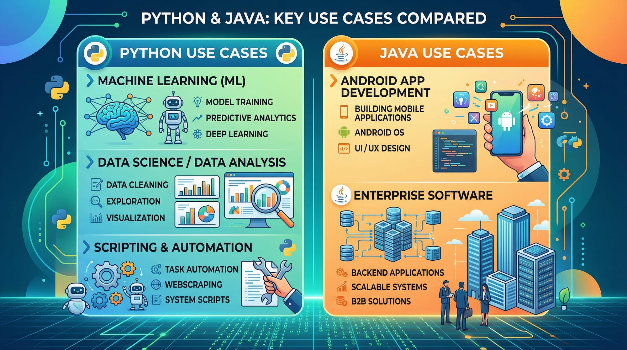 Python is known for its simplicity and is widely used in fields like artificial intelligence, data science, and automation. Java, on the other hand, is known for its performance, scalability, and strong presence in enterprise systems and Android development.