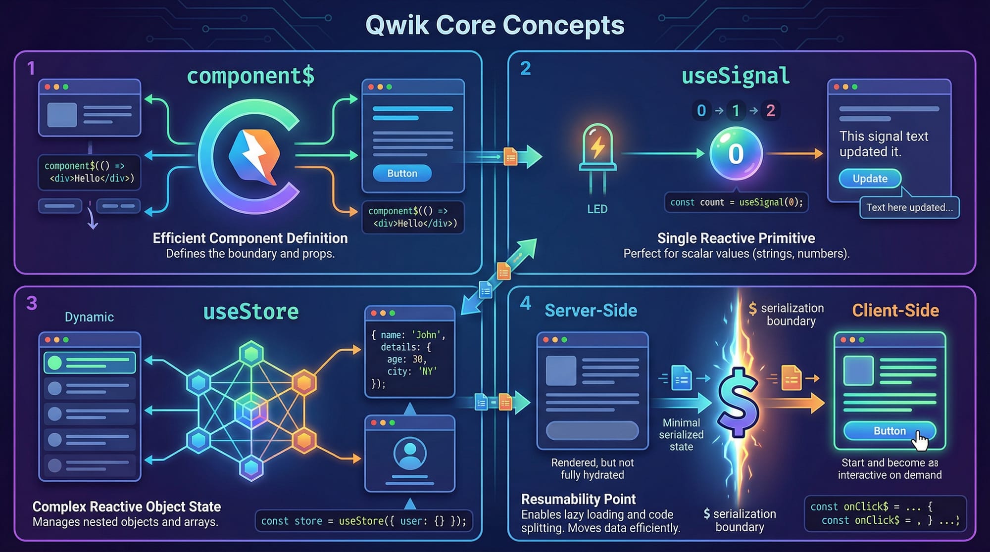 Qwik introduces several unique ideas that distinguish it from frameworks like React or Svelte. Let’s explore them.