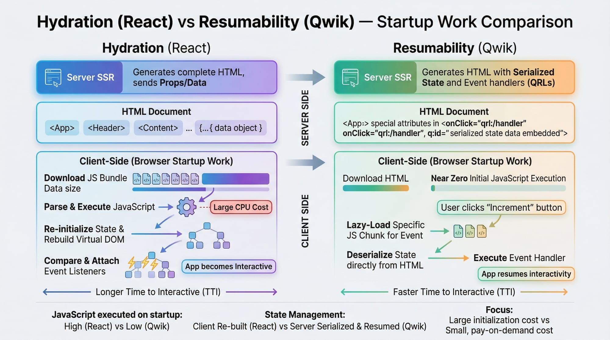 The modern web is evolving rapidly, and JavaScript frameworks dominate how interactive websites are built. Among them, Qwik introduces a groundbreaking concept: resumability and zero hydration. Unlike React or Vue, which hydrate the entire page on load, Qwik allows a page to start instantly with server-rendered HTML and only activate interactive parts when users interact.
