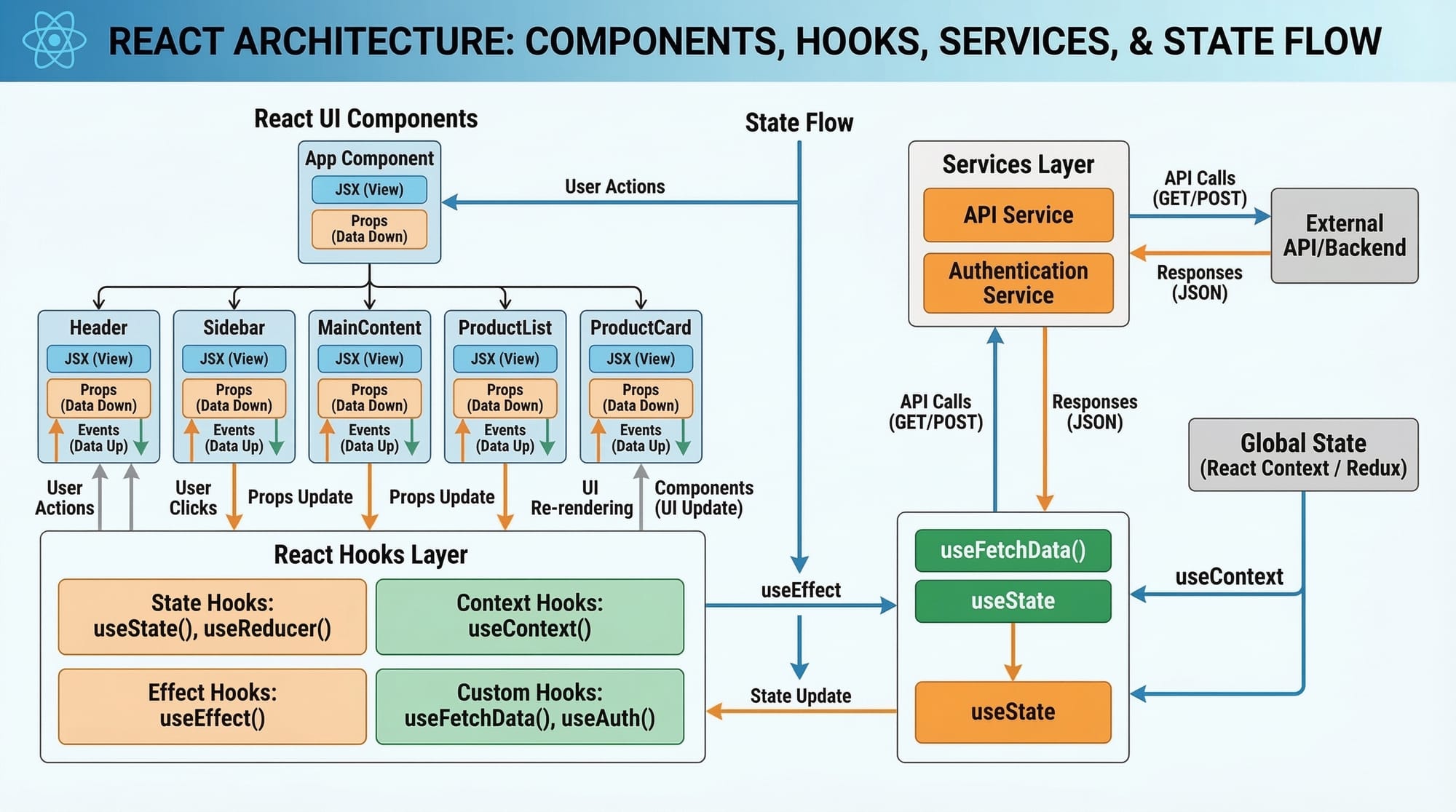 useState([])stores user data.useEffect()fetches users from API.- Data is passed to the UI component.
