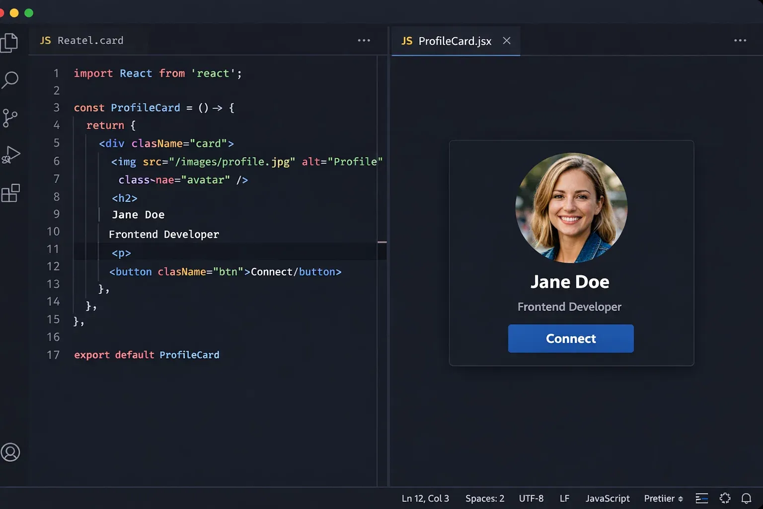 JSX stands for JavaScript XML. It is a special syntax extension for JavaScript that allows you to write HTML-like code directly inside your JavaScript files. At first glance, it looks strange — HTML inside JavaScript? But once you get used to it, JSX makes writing UI components feel very natural and readable.
