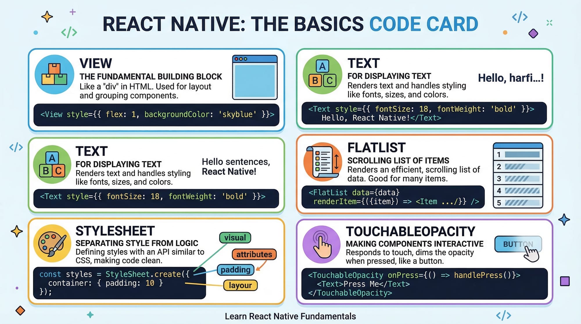 React Native apps are built using components, just like React.js. However, instead of HTML tags like <div> or <p>, React Native uses built-in components such as: