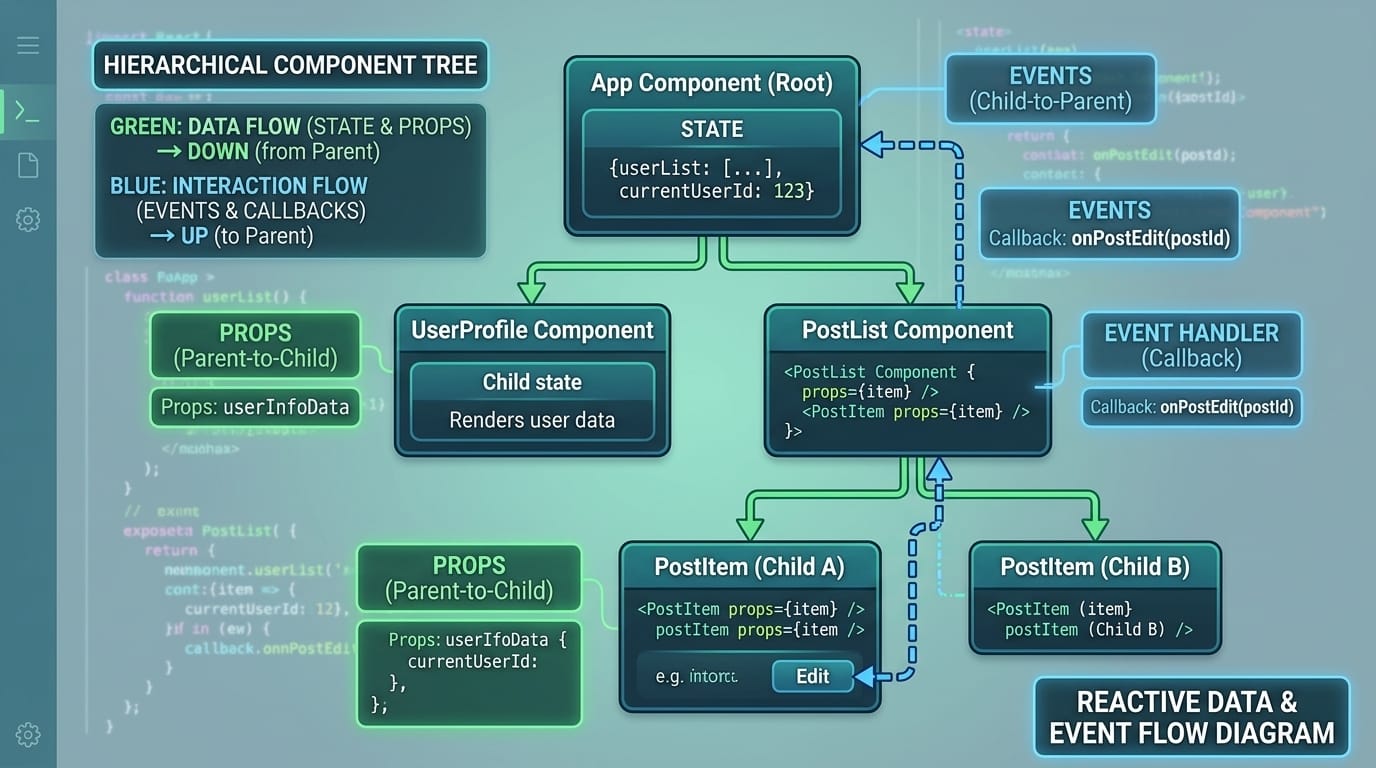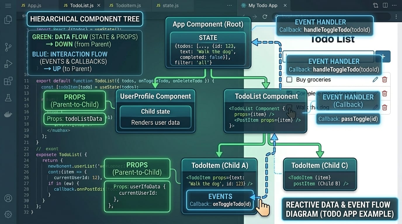 Props (properties) are read-only data passed from parent to child components, while state is mutable data managed within a component. Props cannot be changed by the child component receiving them—they flow down from parents. State, on the other hand, is internal to a component and can be updated using setState or useState hooks. When Fatima passes data from her App component to a TodoItem component, that data travels as props. When the TodoItem needs to track whether it's being edited, that internal tracking happens in state.